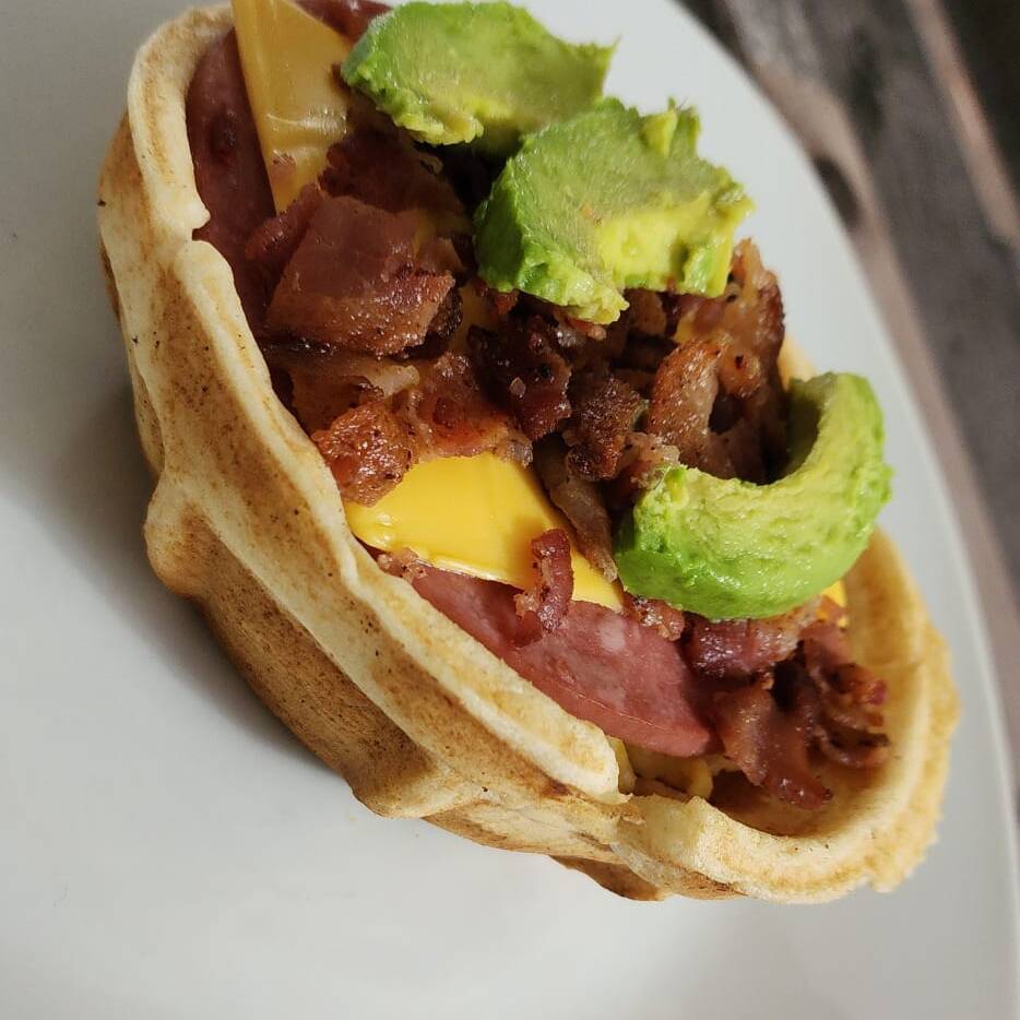 deliciosa canastita del hotcake rellena de huevo al gusto con jamon/ bolognia, queso americano, tocino y aguacate