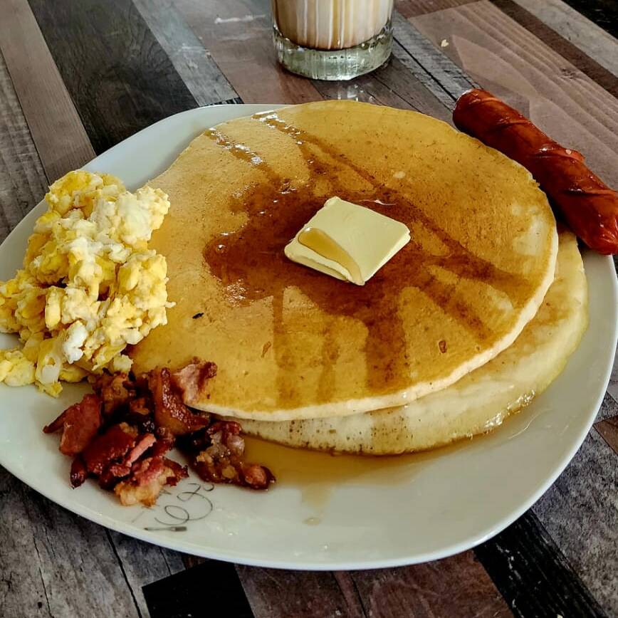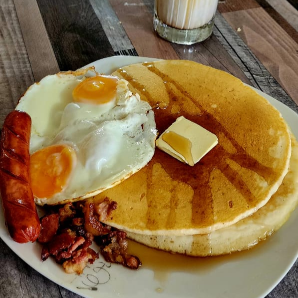 2 pieza de hotcakes de 22cm acompañado con delicioso huevito estrellado, tocino y salchicha, café americano de 10oz GRATIS
