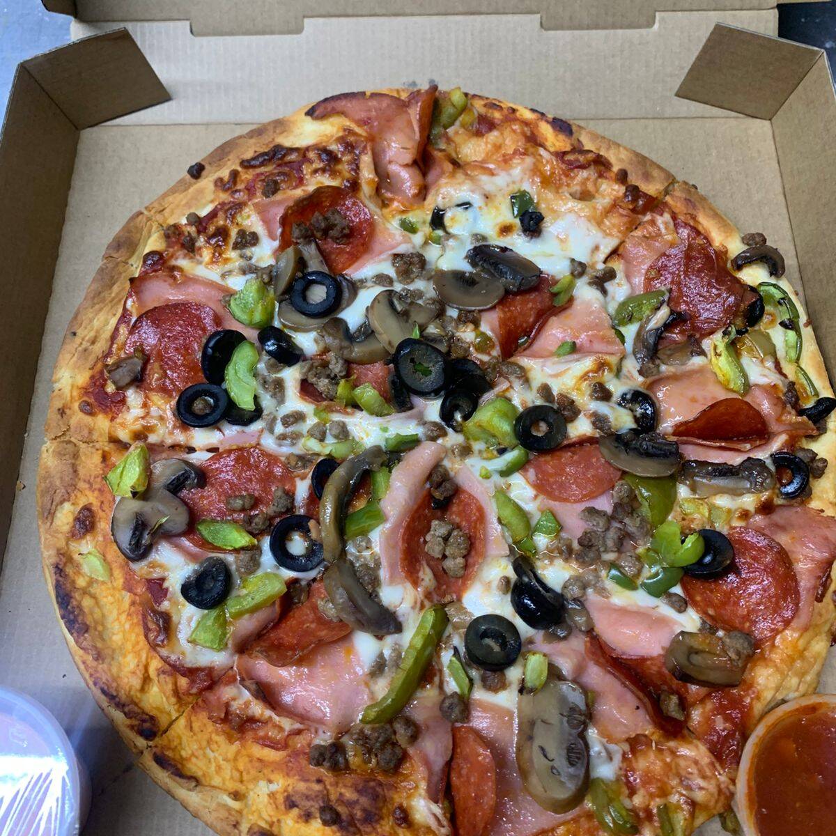 Ingredientes: jamón, pepperoni, salchicha italiana, morrón, champiñones y aceitunas, para los que aman los sabores completos.