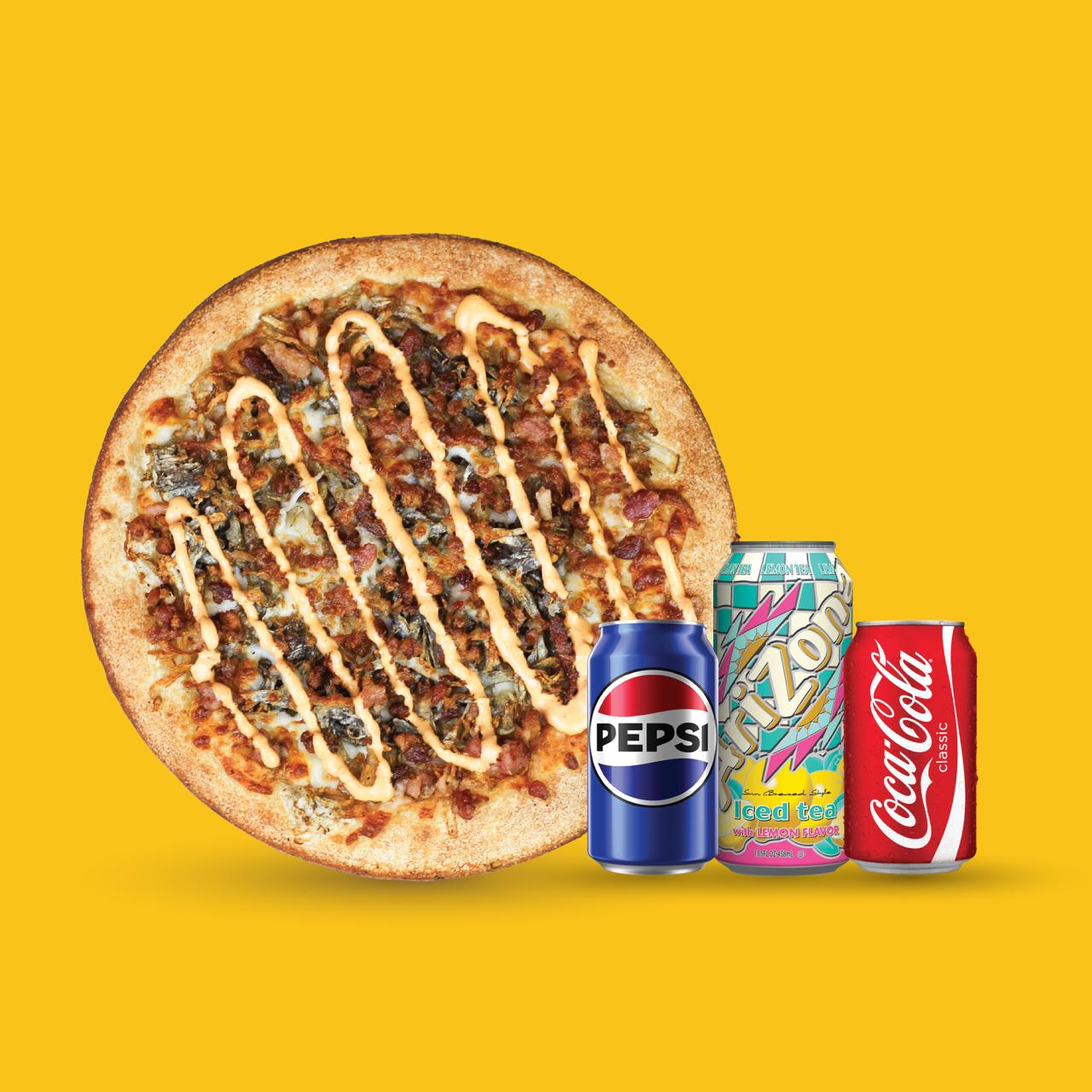 Pizza Personal de 4 Rebanadas con Frijol, Salsa Chipotle, Queso Mozarella, Papa Rallada y Tocino. Incluye una Bebida a elección.