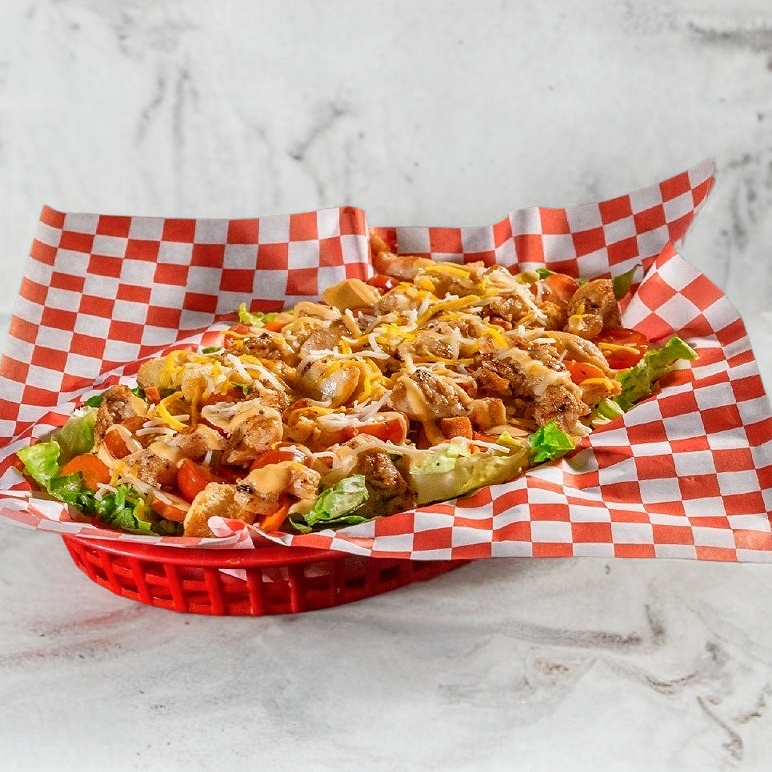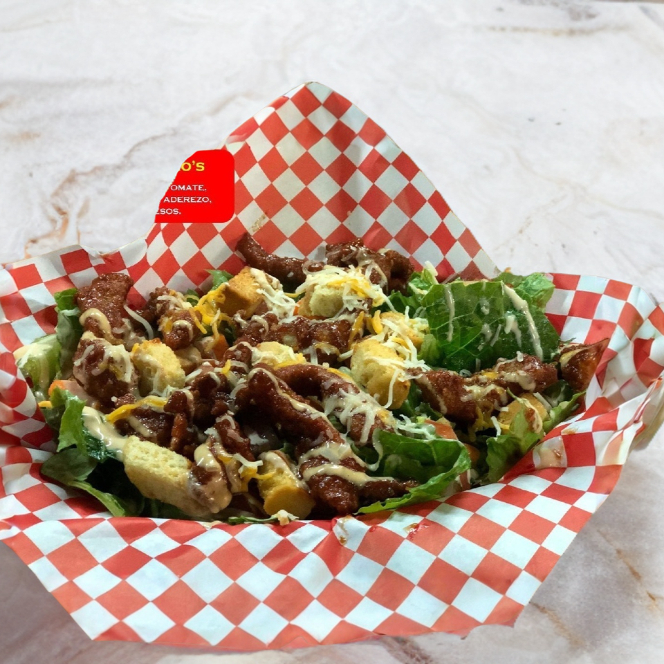 Lechuga picada, tomate, zanahoria, acompañada de 150 gr de boneless bañados en salsa a elegir, aderezo Mario´s y 4 quesos rallados.