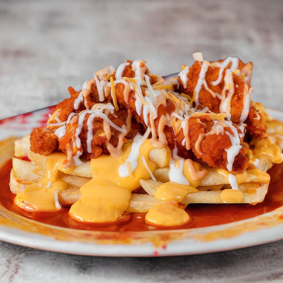 Orden de Papas Francesas bañadas en queso Cheddar, orden de Boneless bañados en tu salsa favorita, aderezo Ranch, aderezo Chipotle y mezcla de quesos rayados