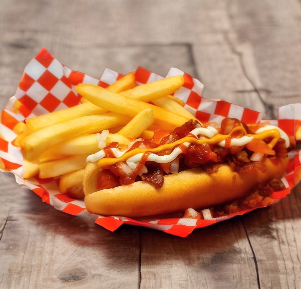 Salchicha de 1/4 lb de carne de res, chilli beans, queso de nachos, 4 quesos rallados, acompañado de 150 gr papas sazonadas.