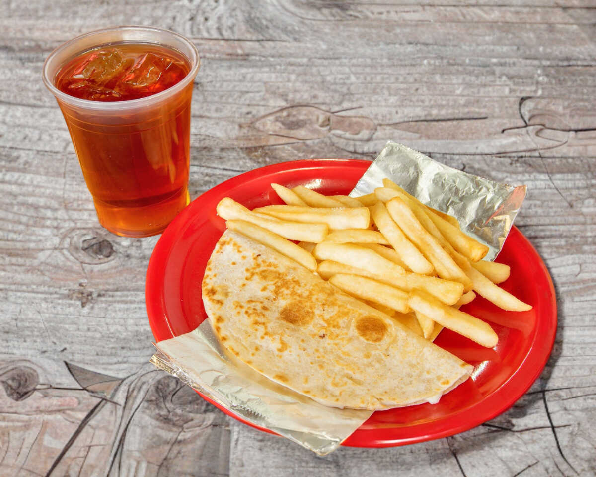 Quesadilla, 1/2 papas francesas y un vaso de agua de 16 oz.