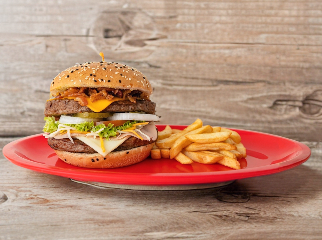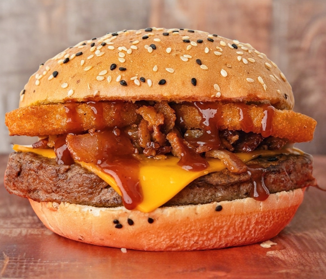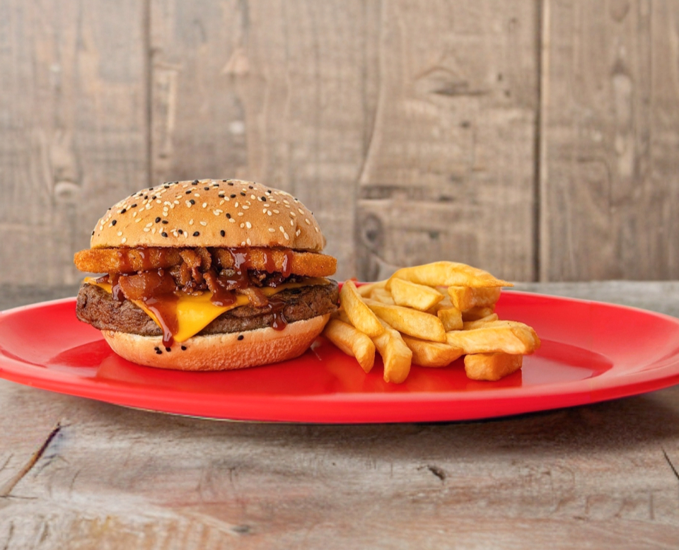 Carne de res, queso amarillo, aros de cebolla, tiras de tocino, salsa BBQ y papas a la francesa.