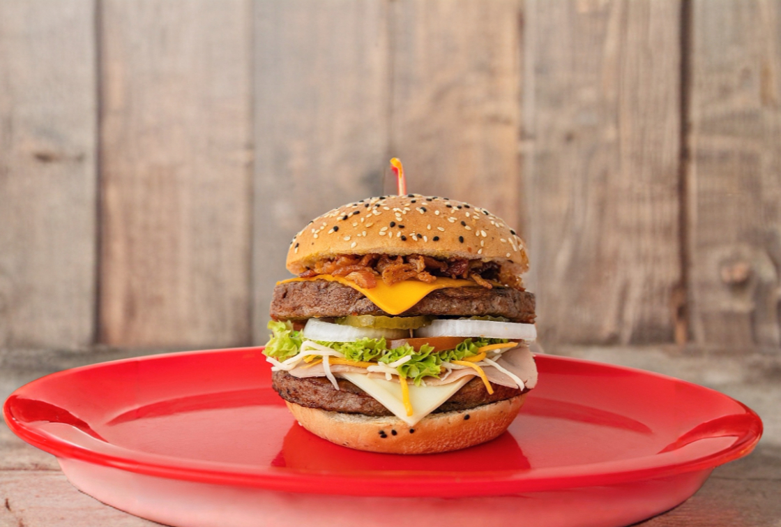 Dos carnes de 1/4 lb de res, queso blanco y amarillo, jamón, mezcla de 4 quesos, 100 gr de tocino picado, lechuga, tomate, cebolla, pepinillos, aderezo mario´s, pan de hamburguesa con ajonjolí