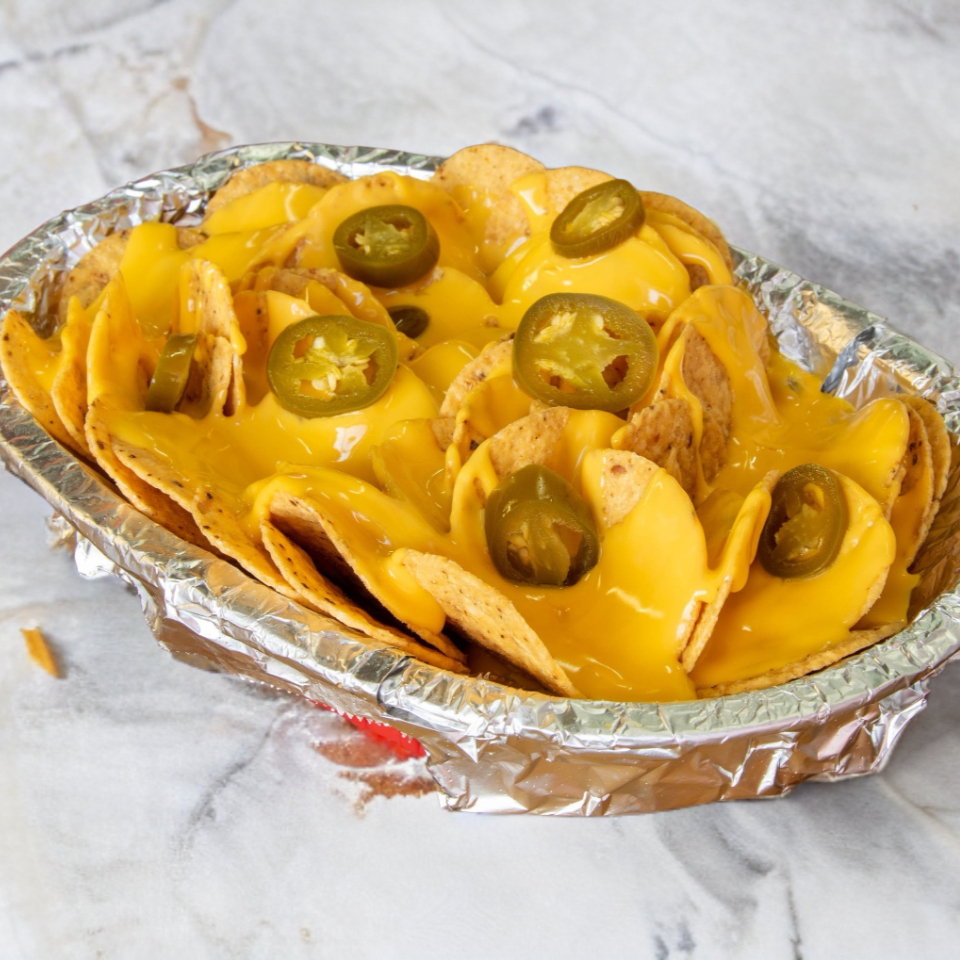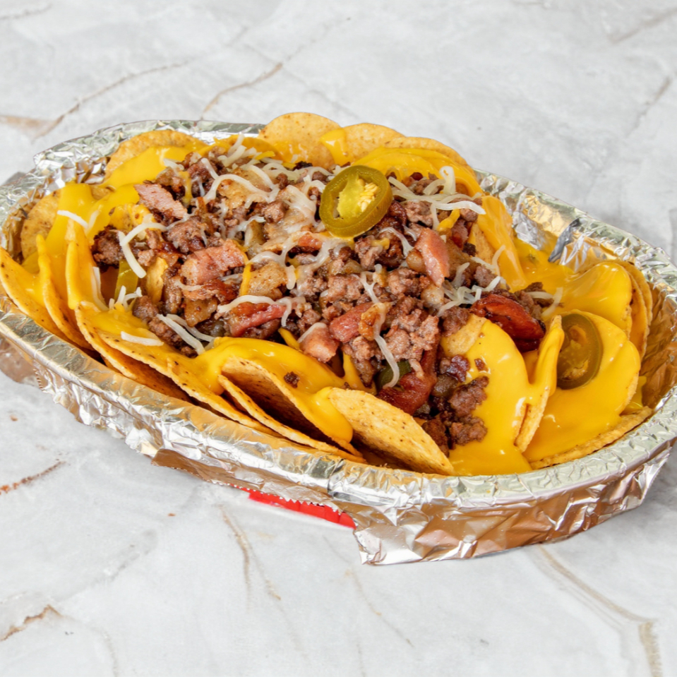 Nachos de maíz bañados en queso cheddar, carne de res, tocino frito, mezcla de quesos.
