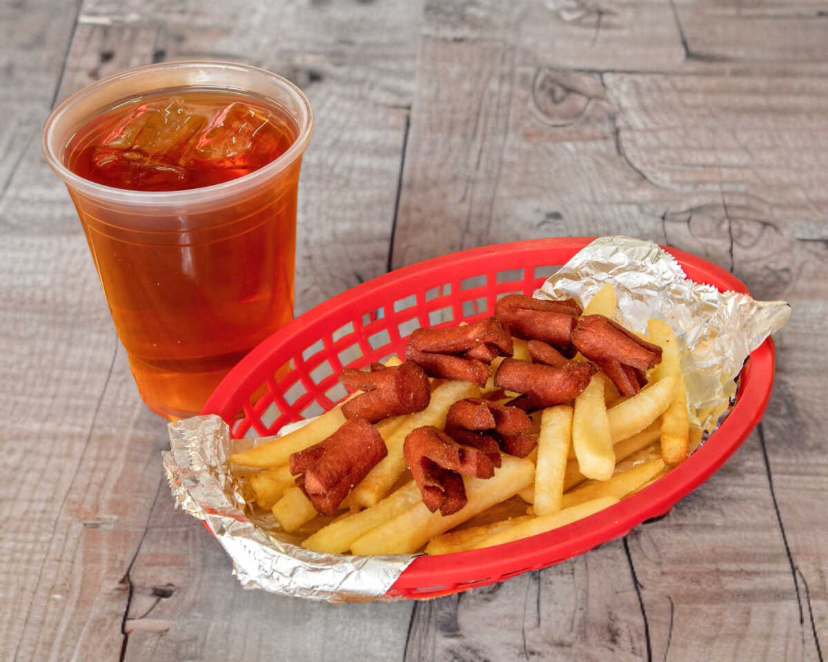 Salchichas fritas, salchipulpos, 1/2 orden de papas a la francesa, vaso 16oz de agua de sabor.