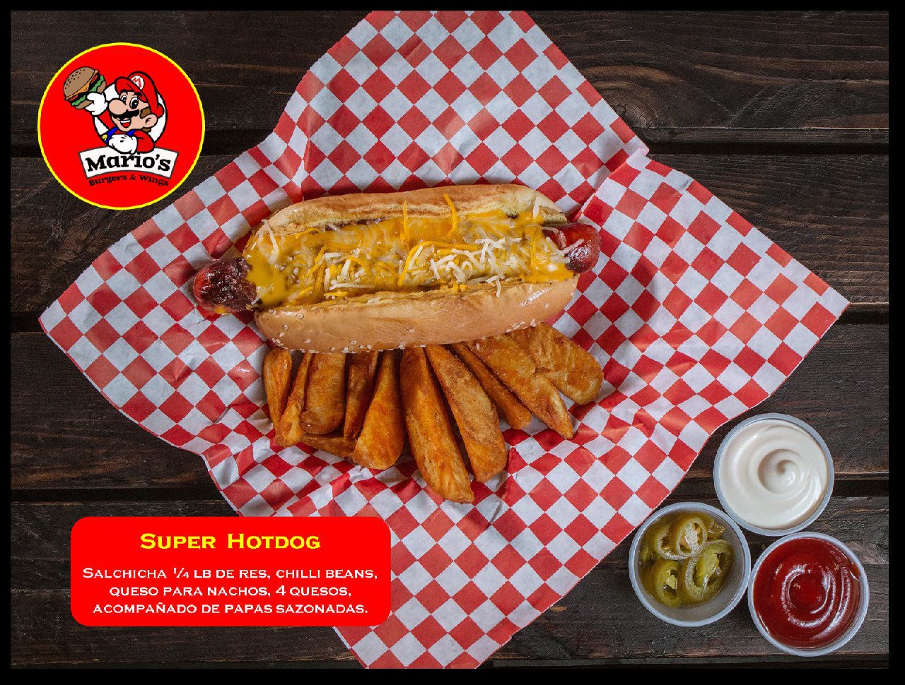 Lechuga, tomate, cebolla, pepinillo, doble carne, 3 quesos, jamón, tocino, aderezo Mario's y papas a la francesa.