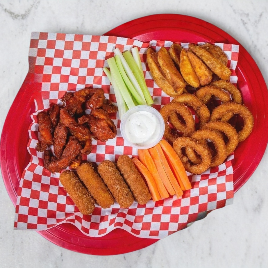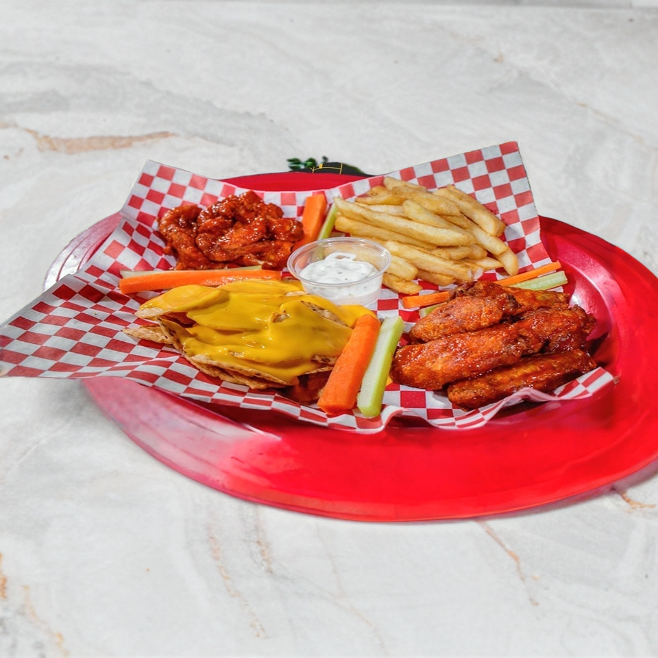 100 g de pechuga de pollo (peso antes de cocinar) empanizada cocinada a la perfección y bañada en salsa de su elección, media orden de alitas (aproximadamente 5 pz), bañadas en salsa, nachos crujientes con queso cheddar, papas a la francesa (150 g antes de freír), doradas y perfectas como acompañamiento, baritas de zanahoria y apio, ranch
