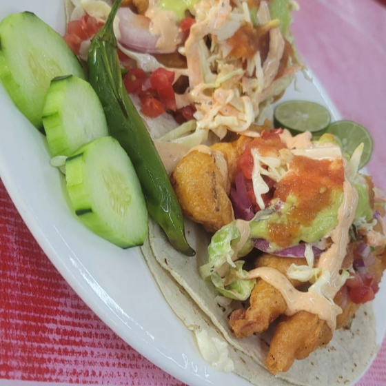 Taco de camarón fresco preparado con el sazón especial de la casa.