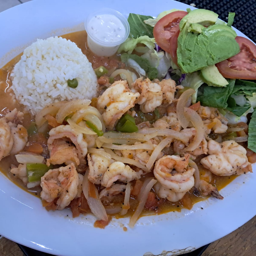 Camarones salteados con tomate, cebolla y chile verde en una salsa tradicional.