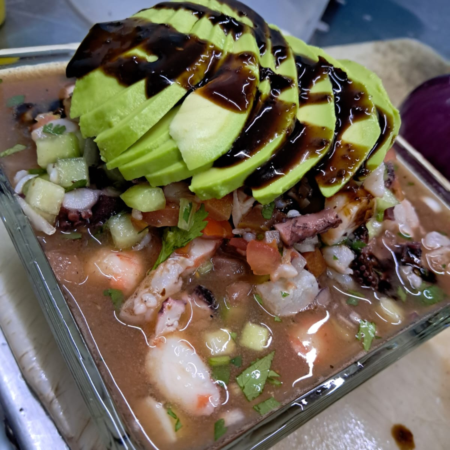Mezcla de la casa con pescado, camarón crudo, camarón cocido y pulpo fresco.