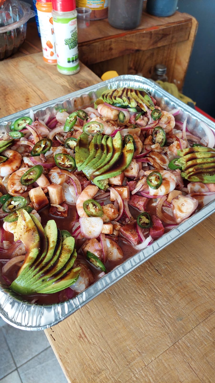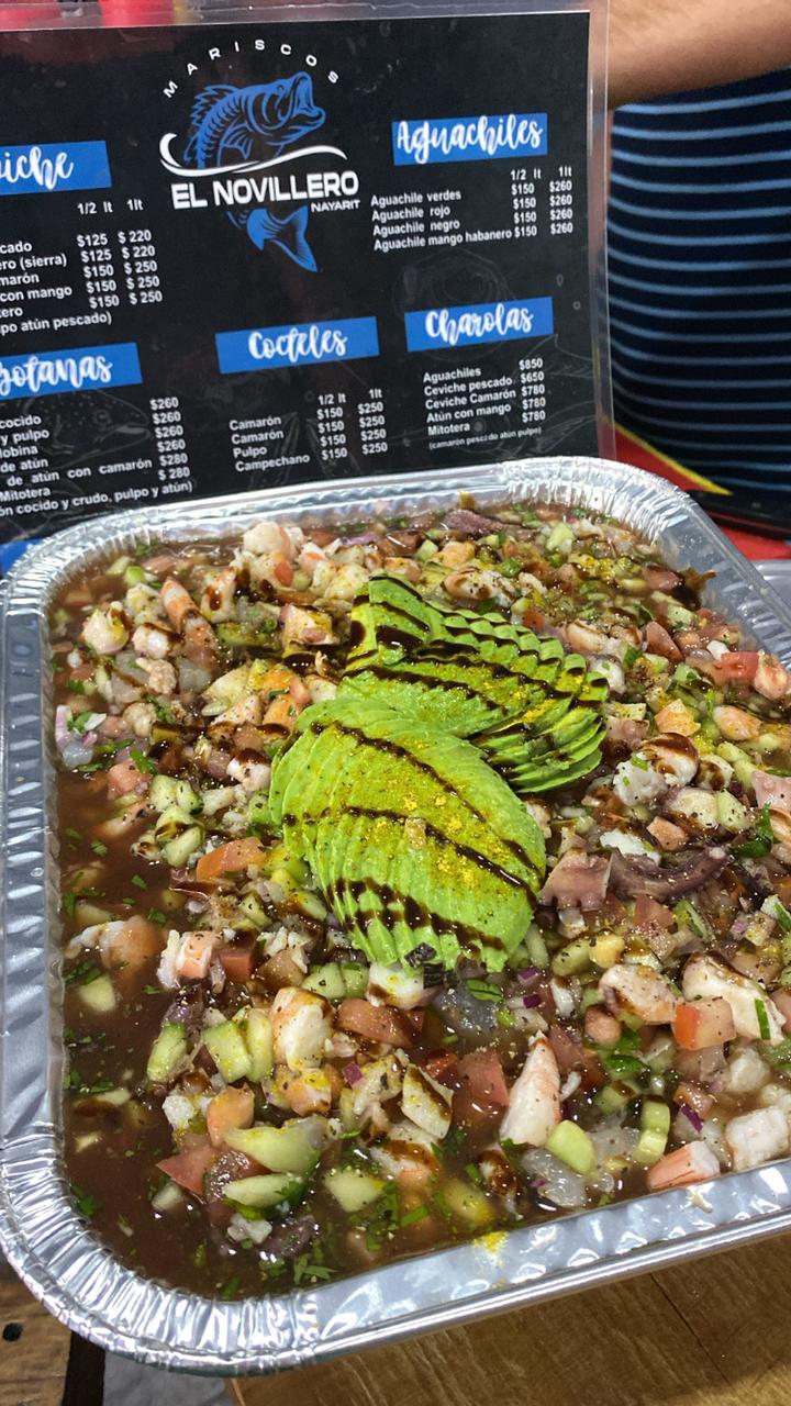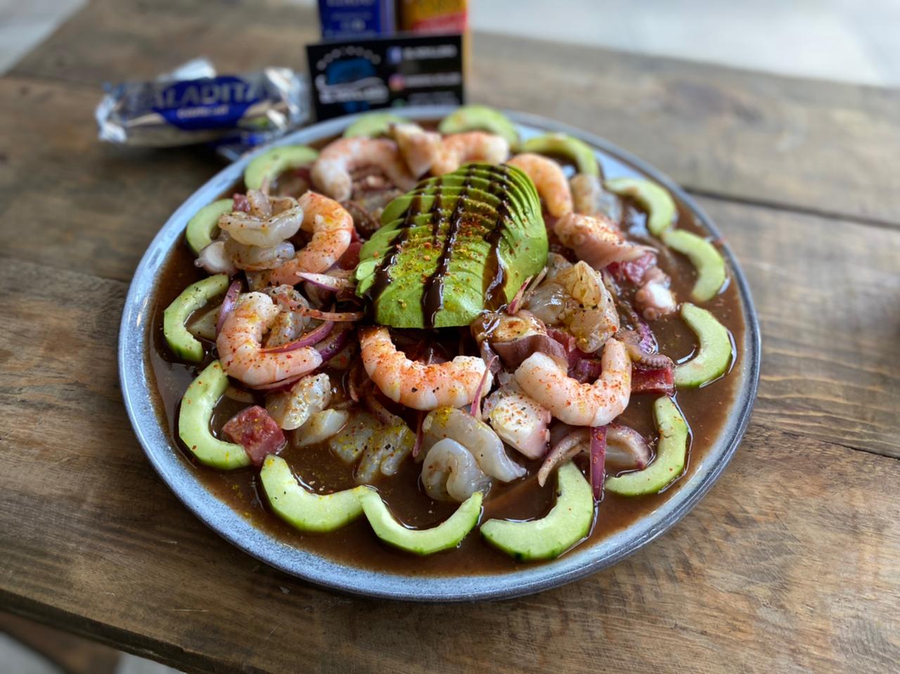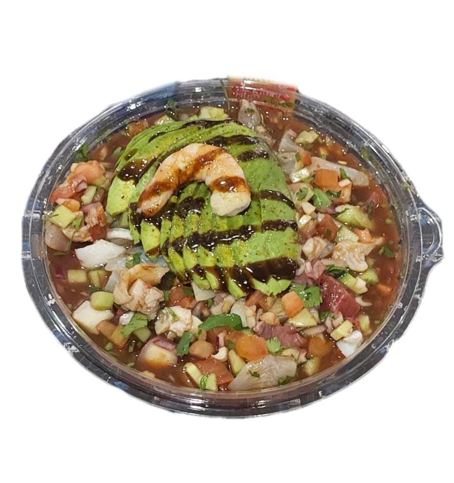 camaron cocido y curtido, pulpo, atún, callo, cebolla, pepino, serrano, aguacate, bañado en salsa negras de la casa.