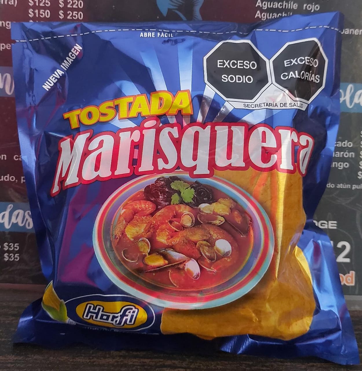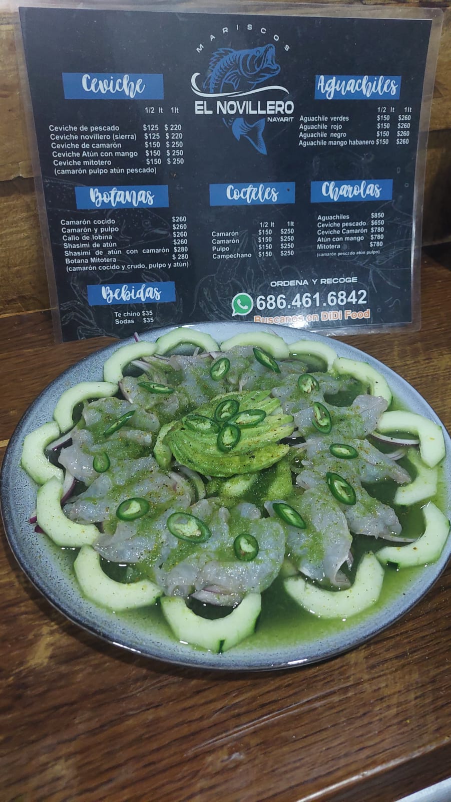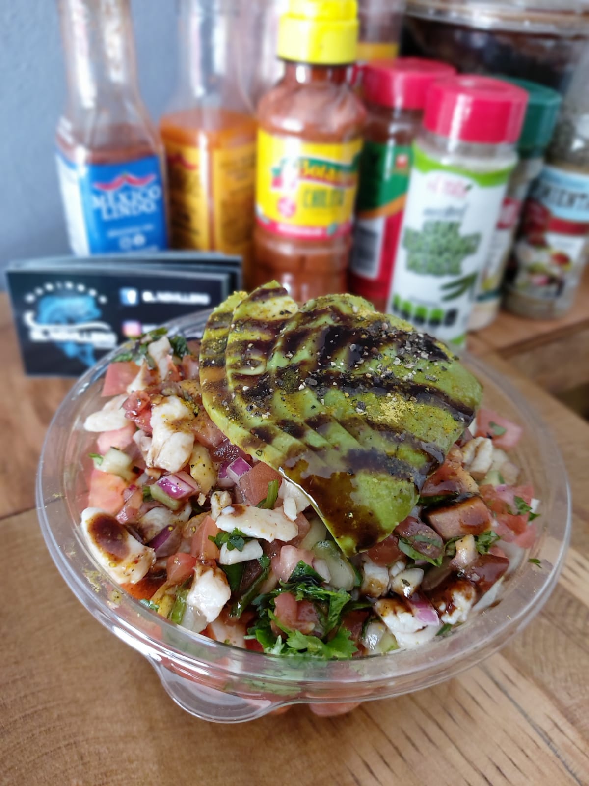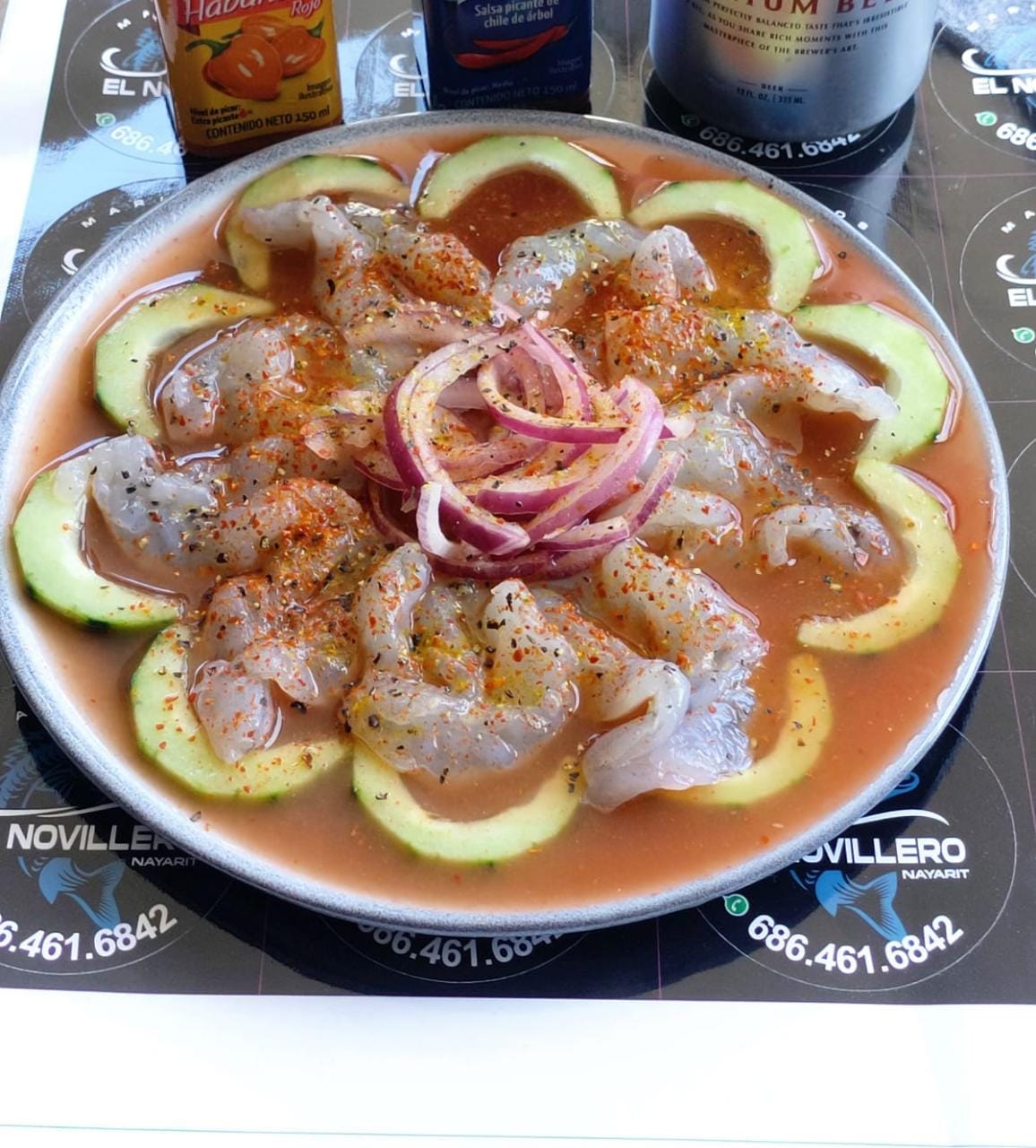 camaron cocido y curtido, pulpo, atún, callo, cebolla, pepino, serrano, aguacate, bañado en salsa negras de la casa.