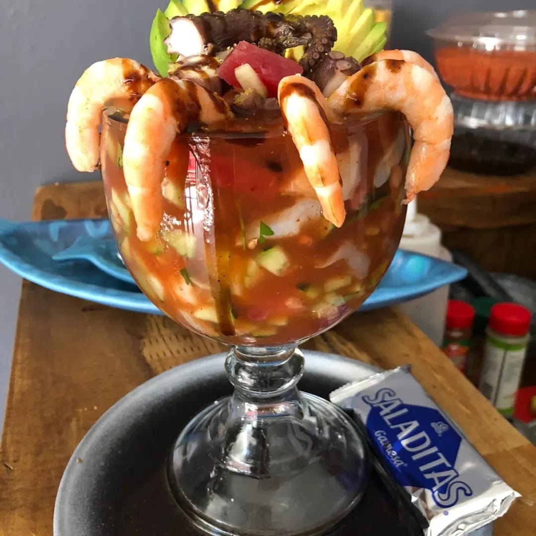 camarones, pepino tomate cebolla cilantro aguacate jugo de camaron preparado