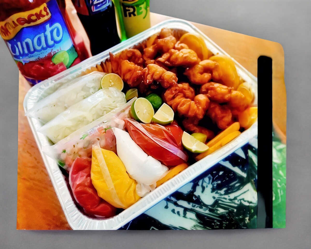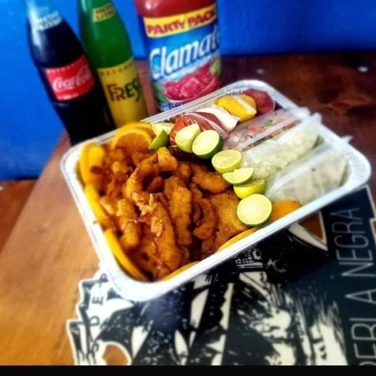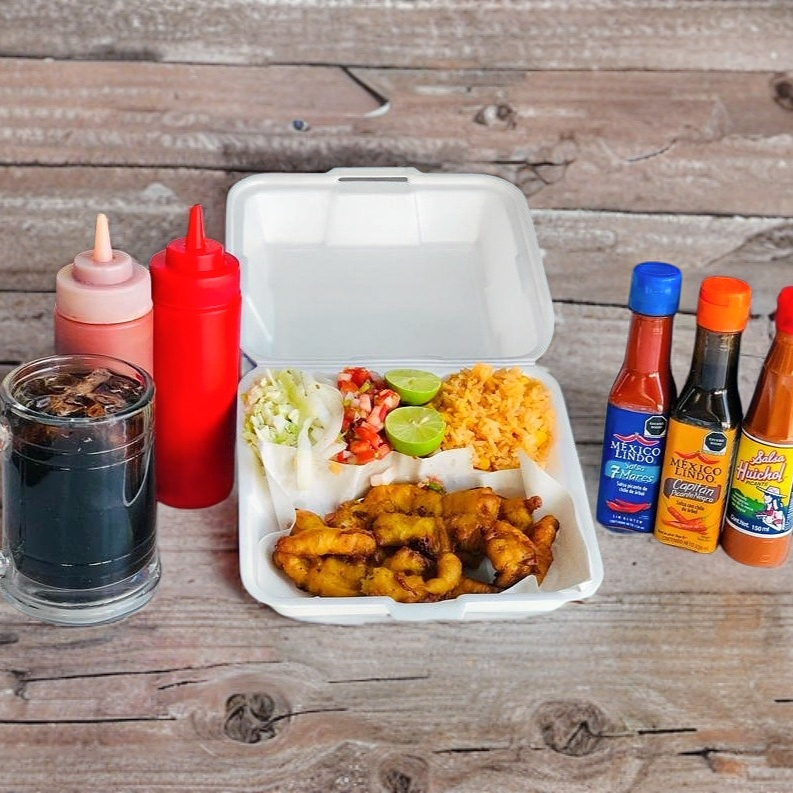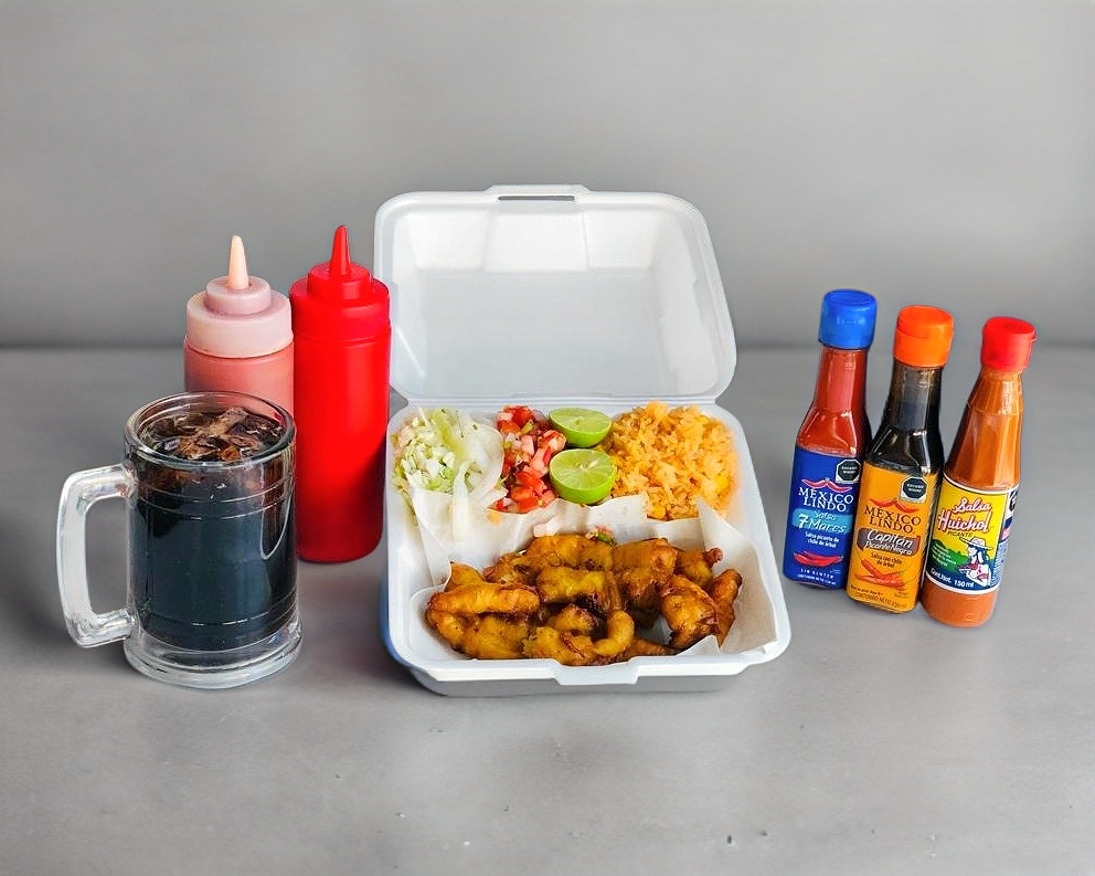 Incluye salsa bandera , cebolla curtida, limón, repollo, catsup , salsa roja , arroz y 3 tortillas de maíz + Bebida del Dia 500ml