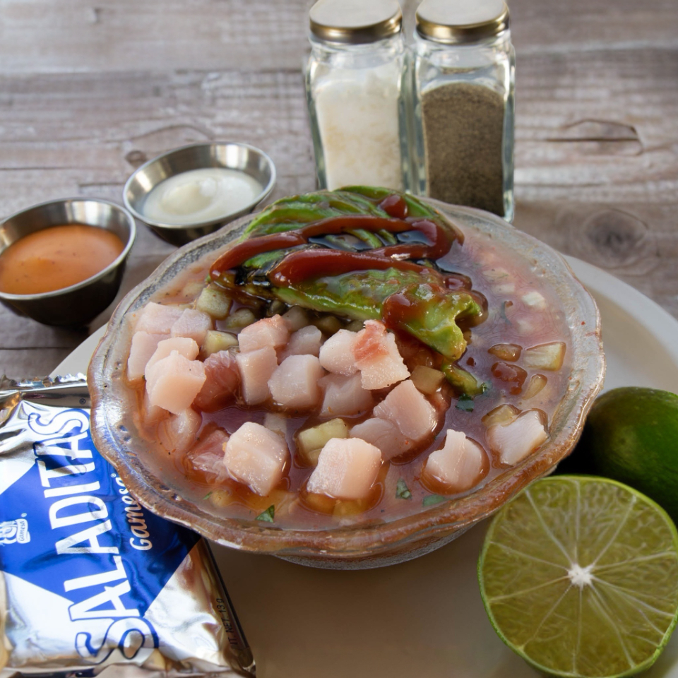 Pescado curtido acompañado de verduras , tostadas y galletas con clamato