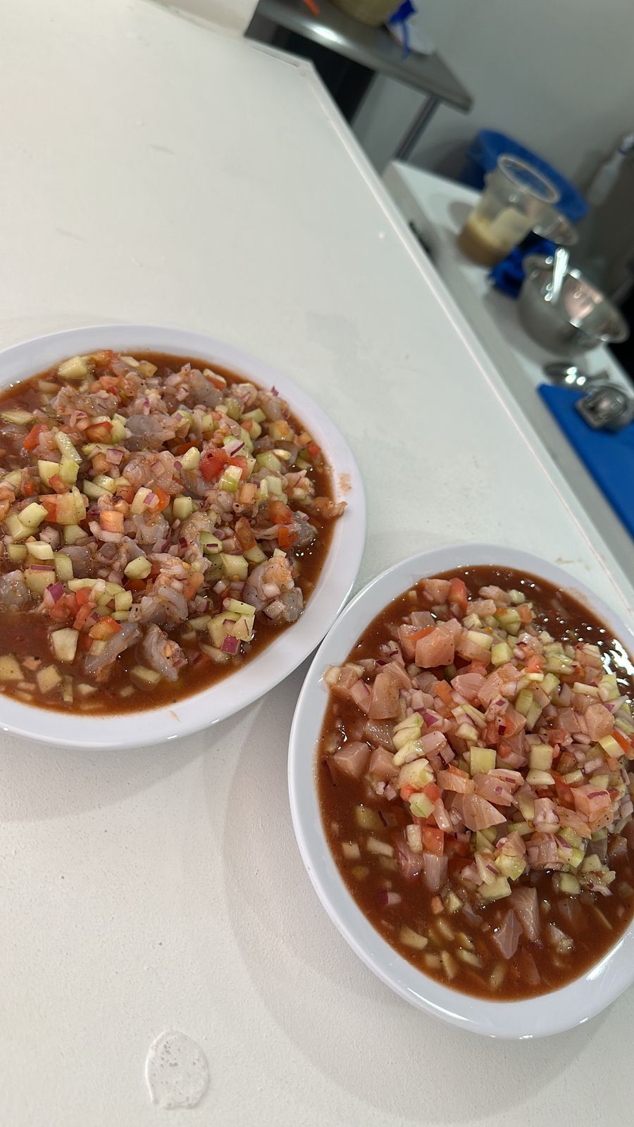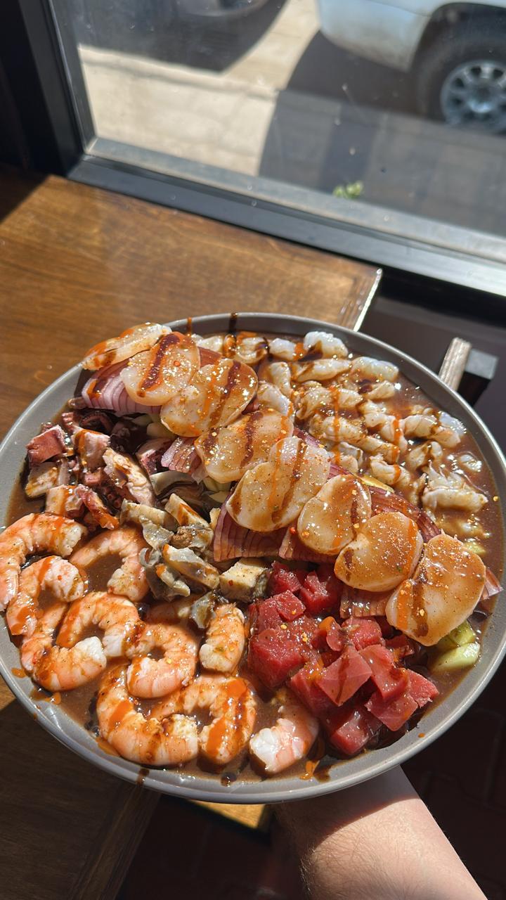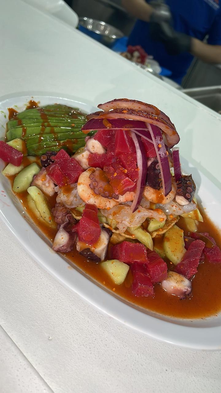 Camarón cocido y curtido con pescado, atún, caracol y pulpo, salseado con pepino, tomate, cebolla morada y chile serrano.