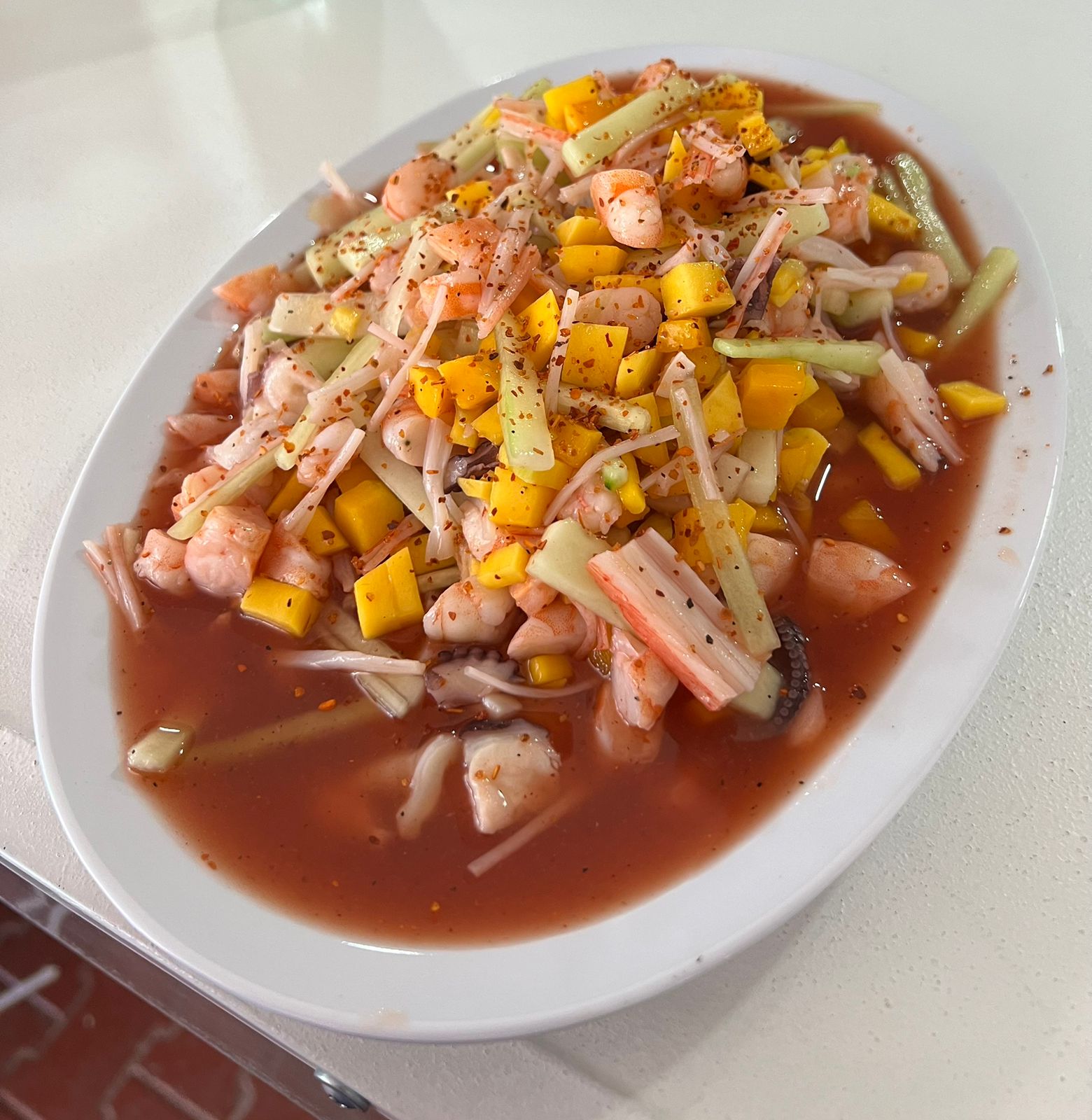 Una mezcla especial de camarón cocido, pulpo y kanikama con pepino y mango.