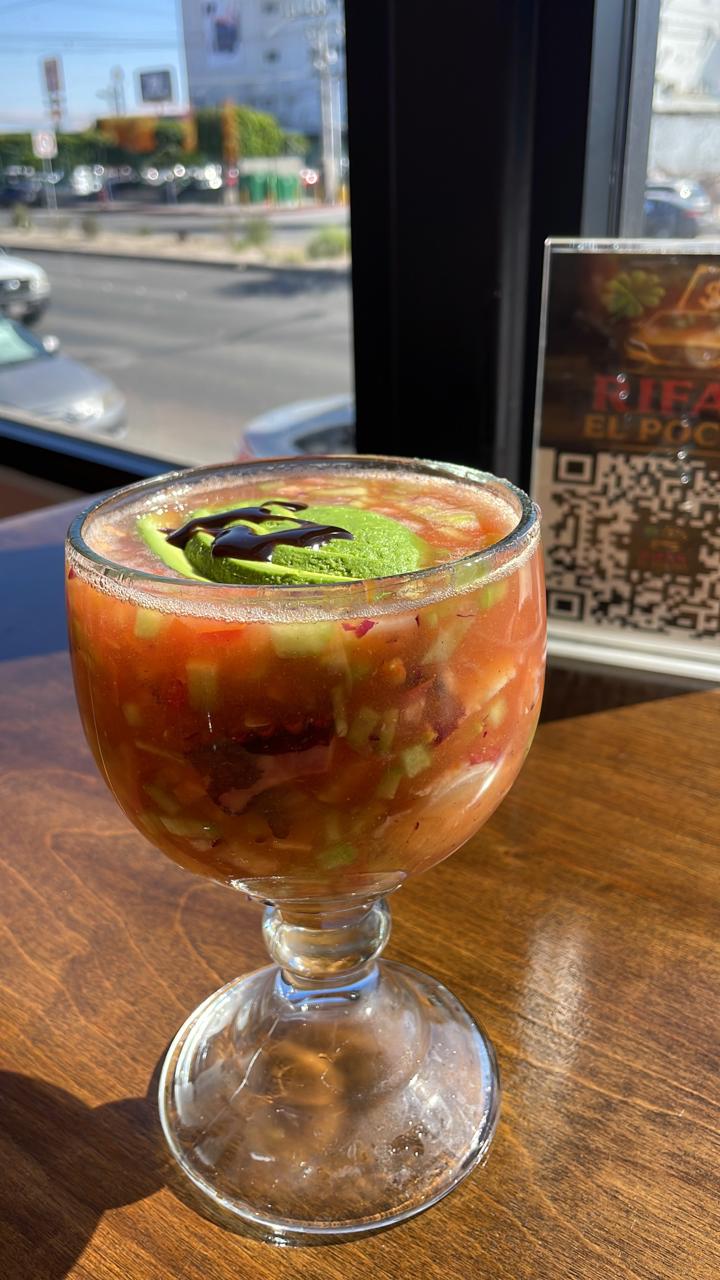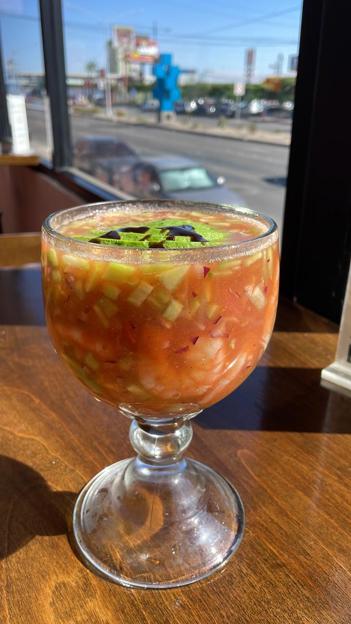 Camarón cocido con un delicioso caldo de camarón preparado al estilo Sobrino, con pepino, cebolla y tomate.