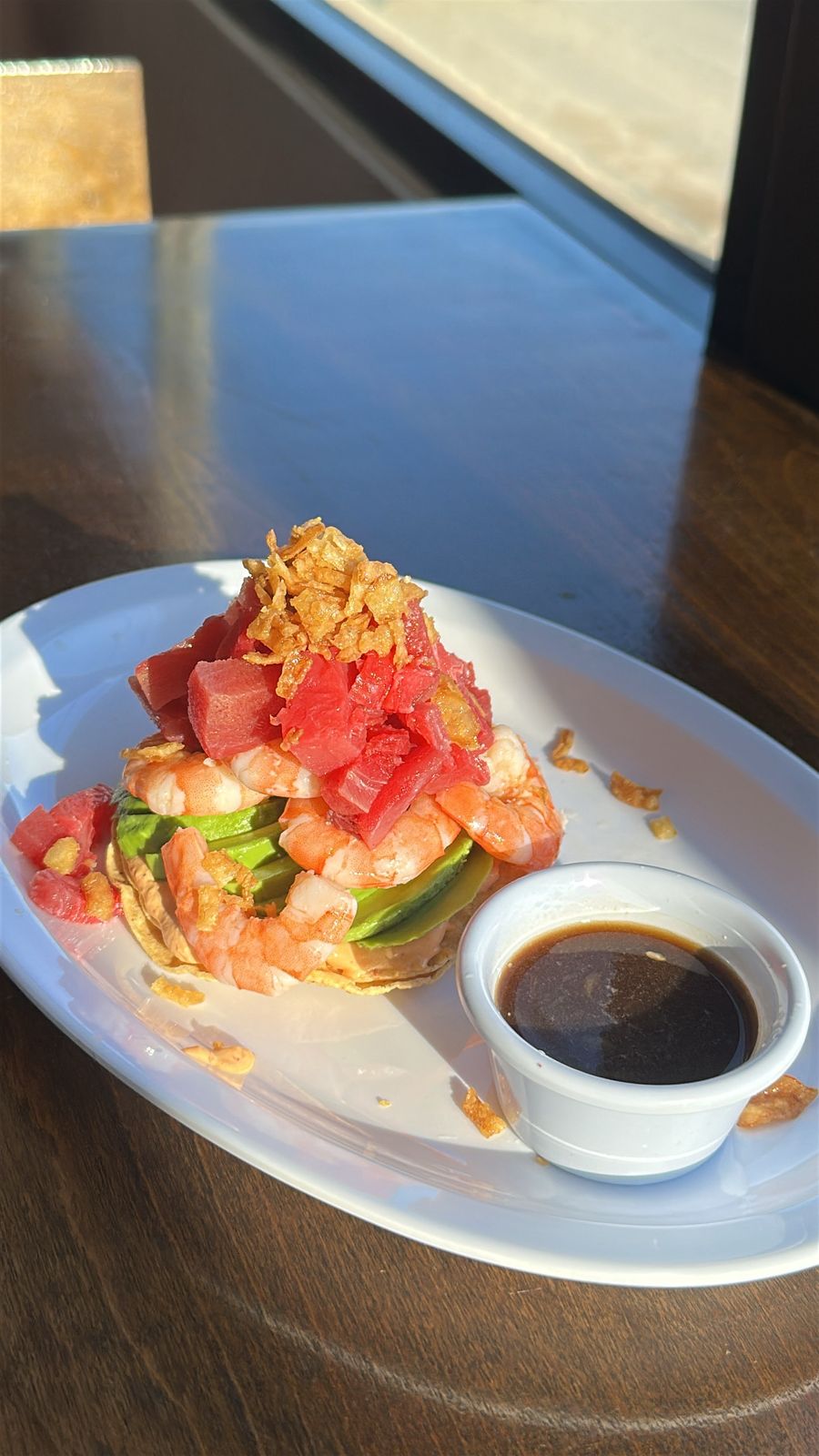Atún fresco sobre base de mayo spicy y aguacate, coronada con crujiente wontón y pasta filo, bañada en salsas negras.