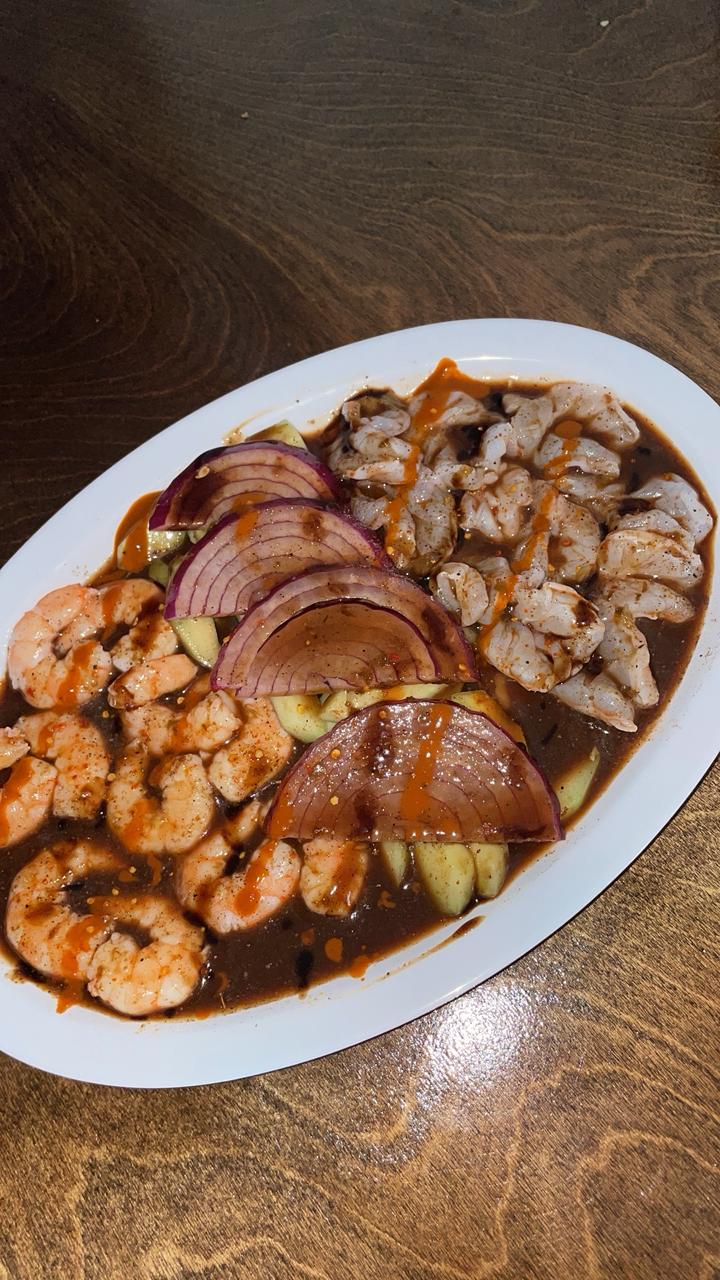 Camarón cocido, camarón crudo, pulpo, ostiones y caracol acompañado de un delicioso caldo de camarón.