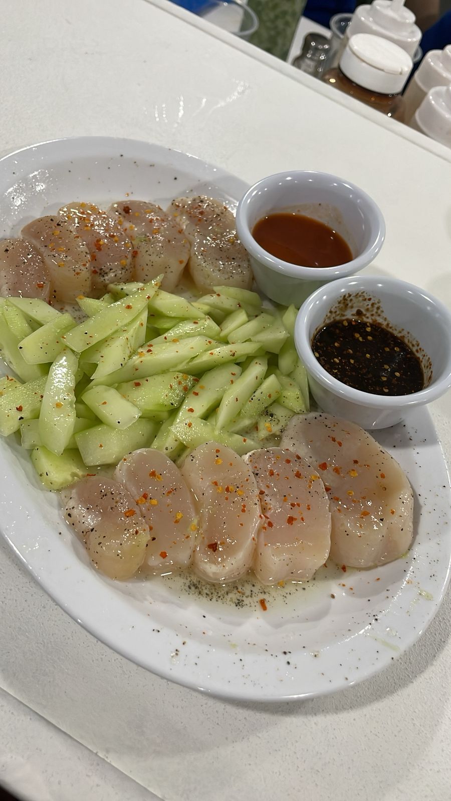 Delicioso y fresco callo de hacha, acompañado de cebolla y pepino.