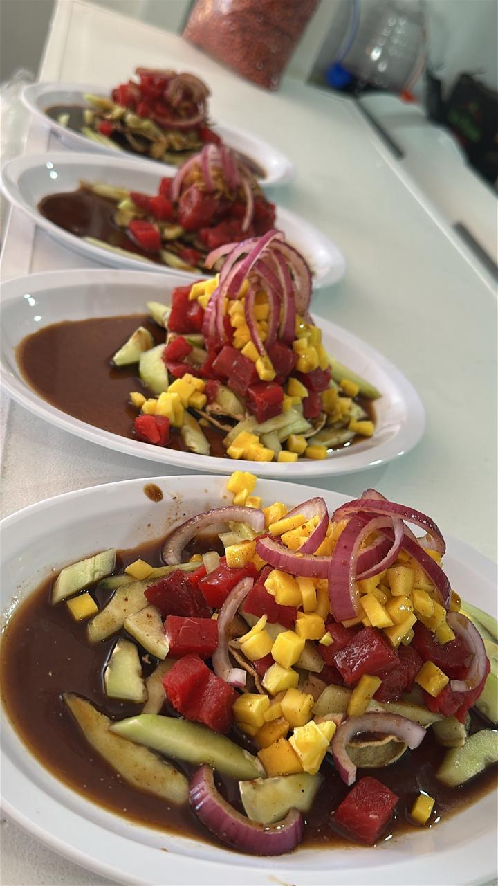Tostada con base de aguacate, camarón curtido y cocido, atún y pulpo, cebolla y pepino, bañada en una deliciosa salsa de la casa.