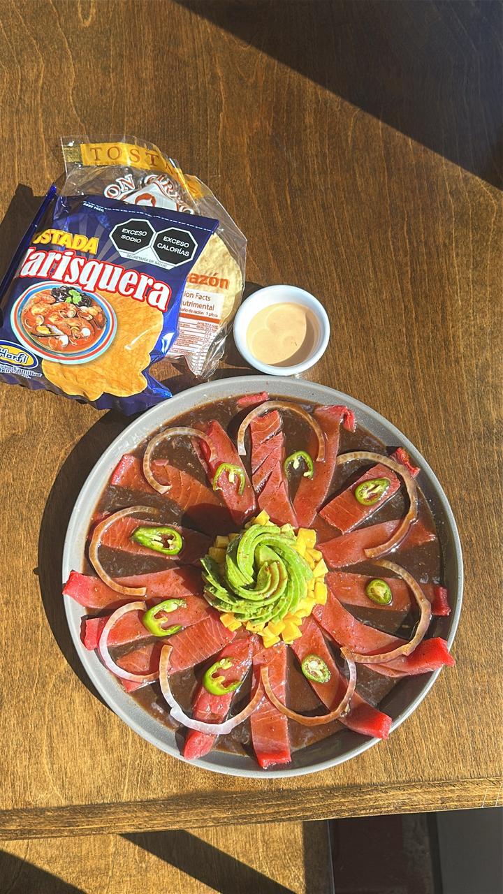 Atún fresco sobre base de chipotle y pepino, coronada con cebolla morada, rodajas de serrano y bañada en salsa negra de la casa.