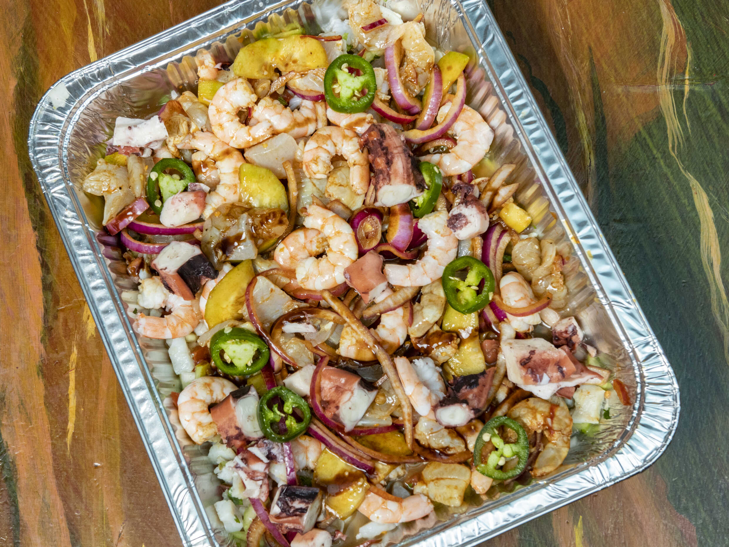 Charola con ceviche de pescado, camarón cocido, camarón aguachile, pulpo, calamar y callo de lobina.