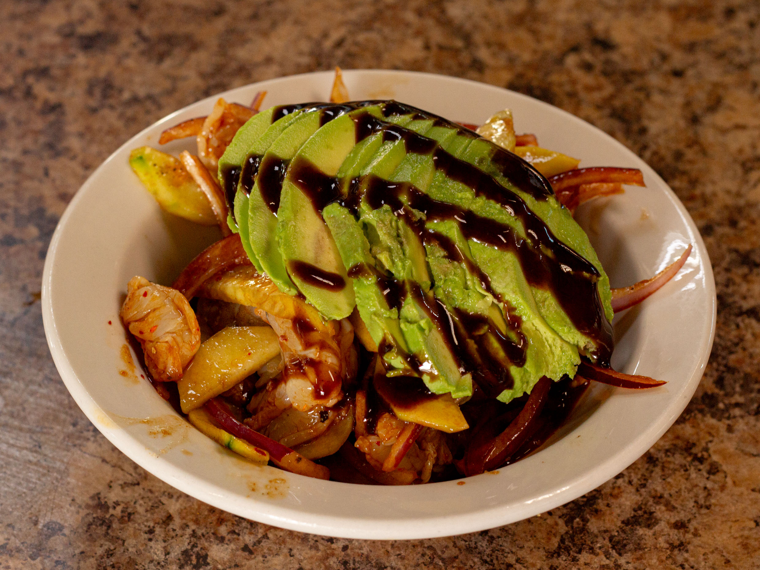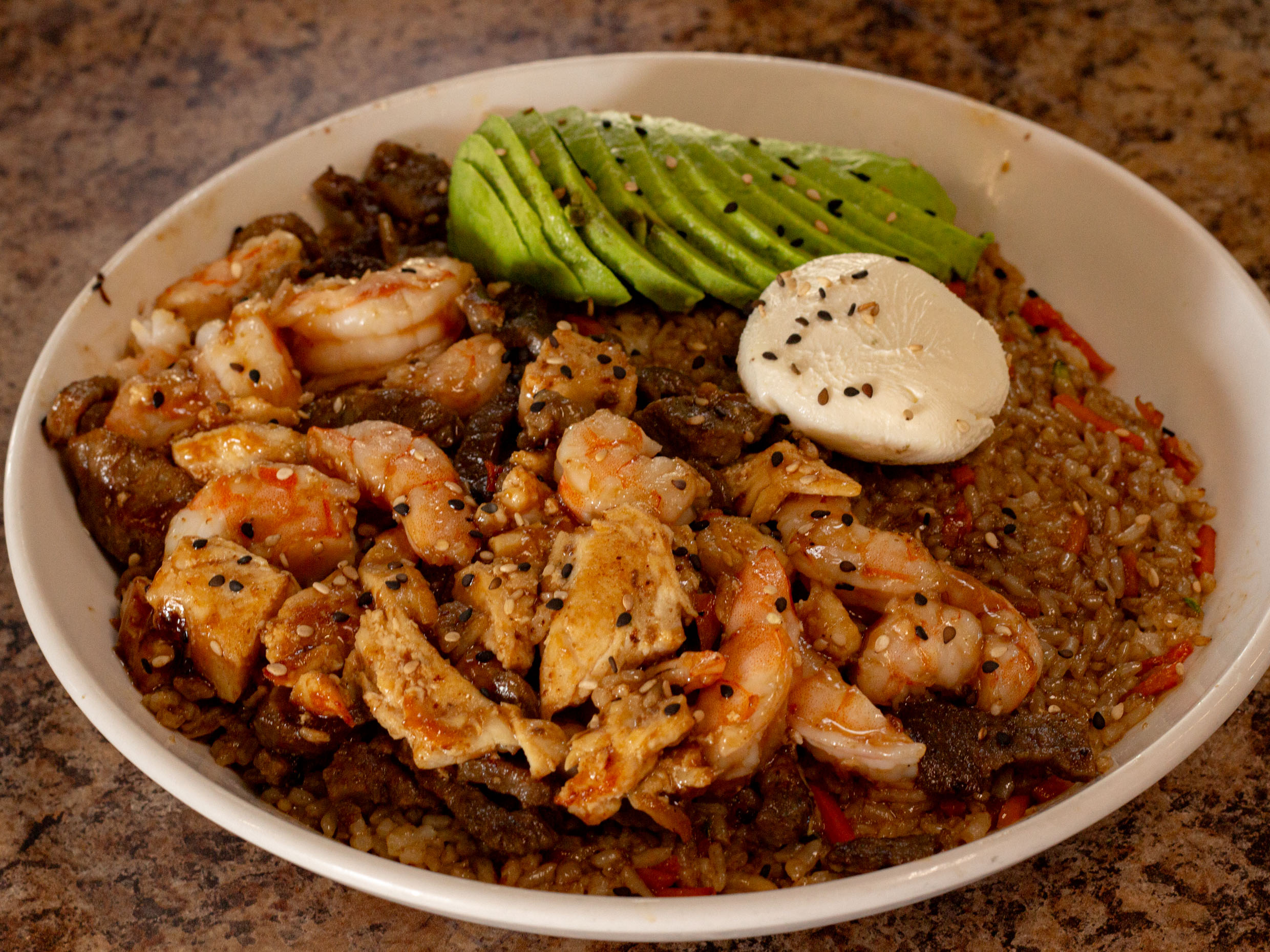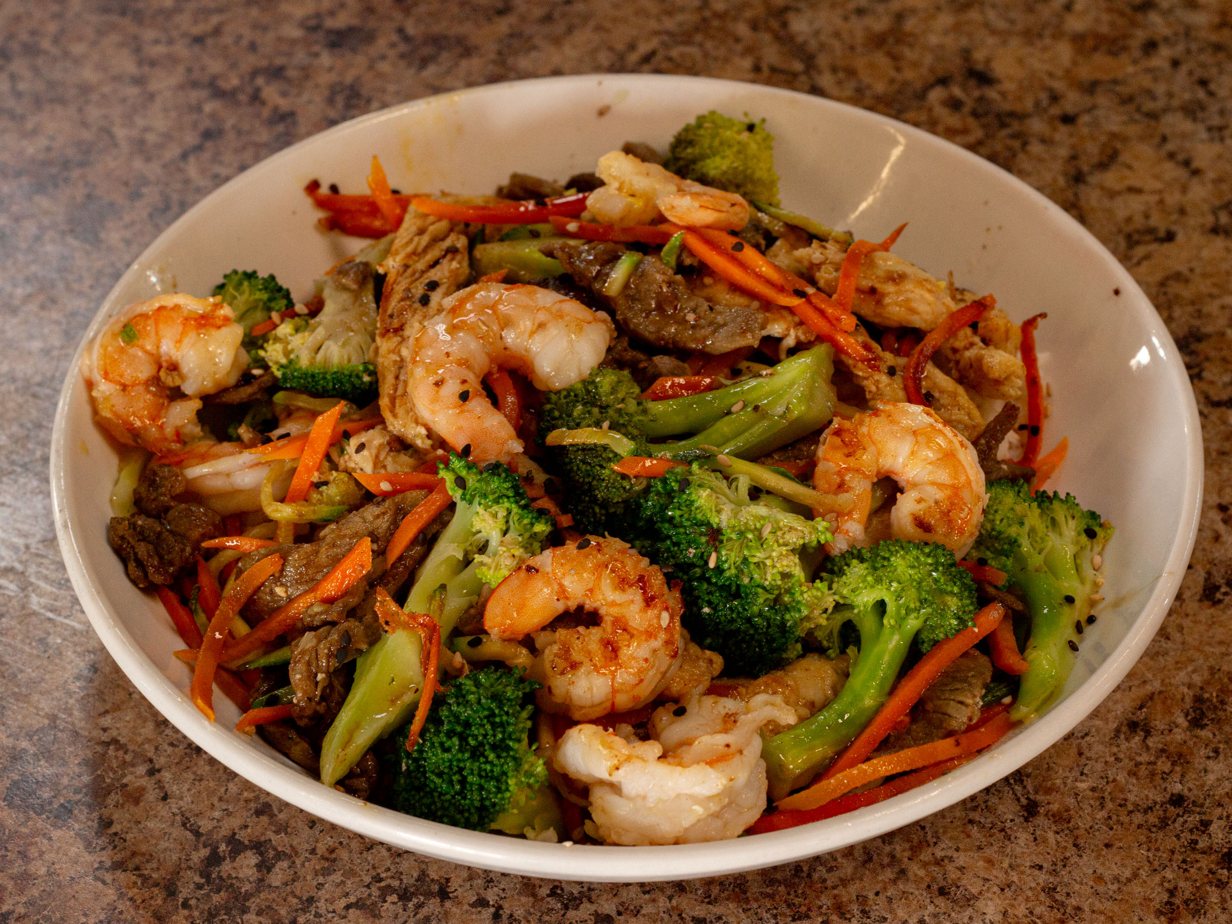 Teriyaki con camarón, pollo y carne.