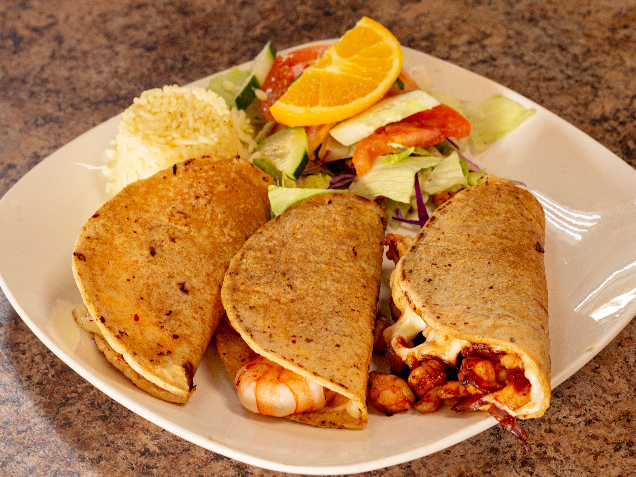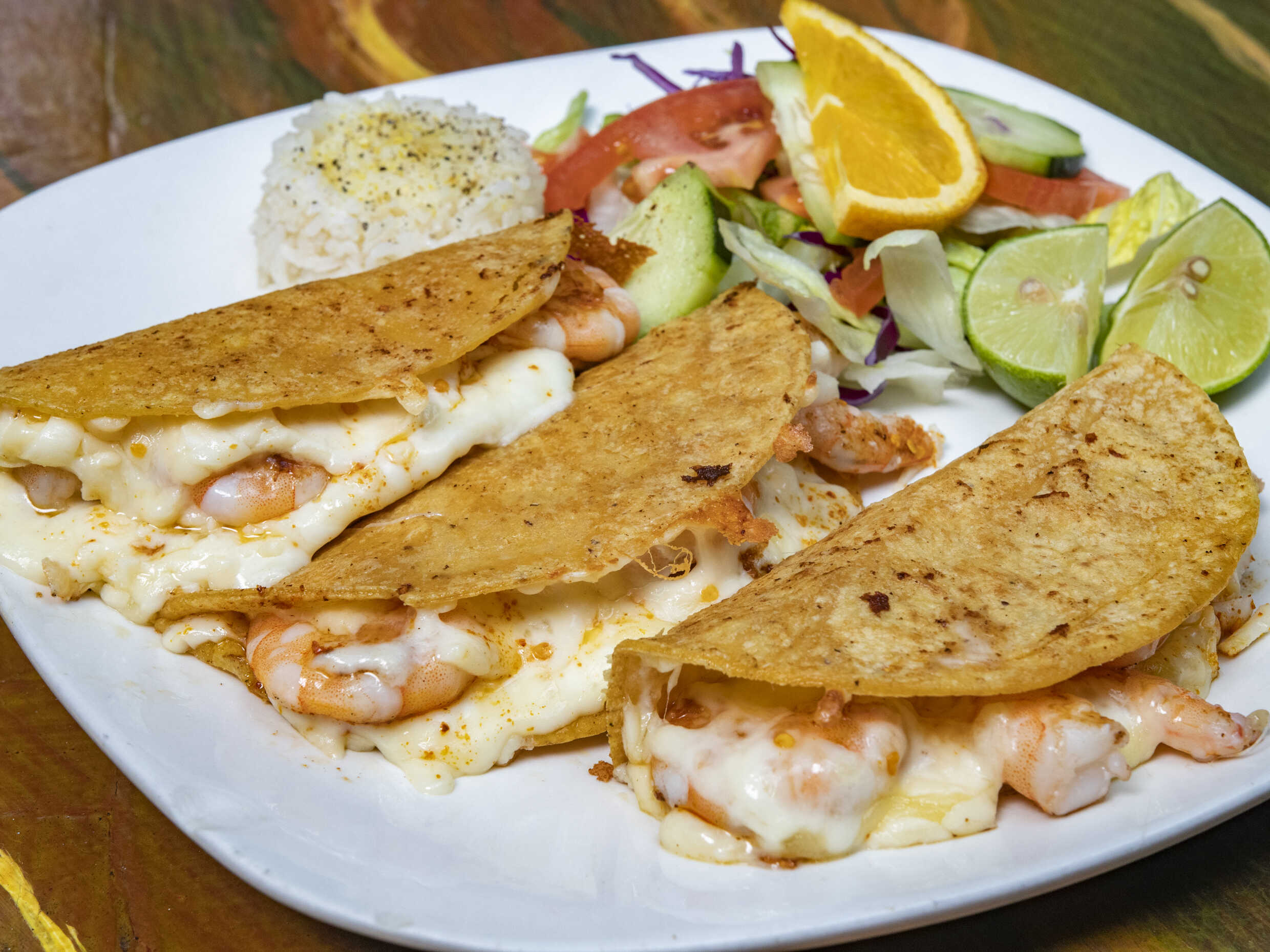 Quesadilla de camarón a la plancha con salsa especial de la casa.