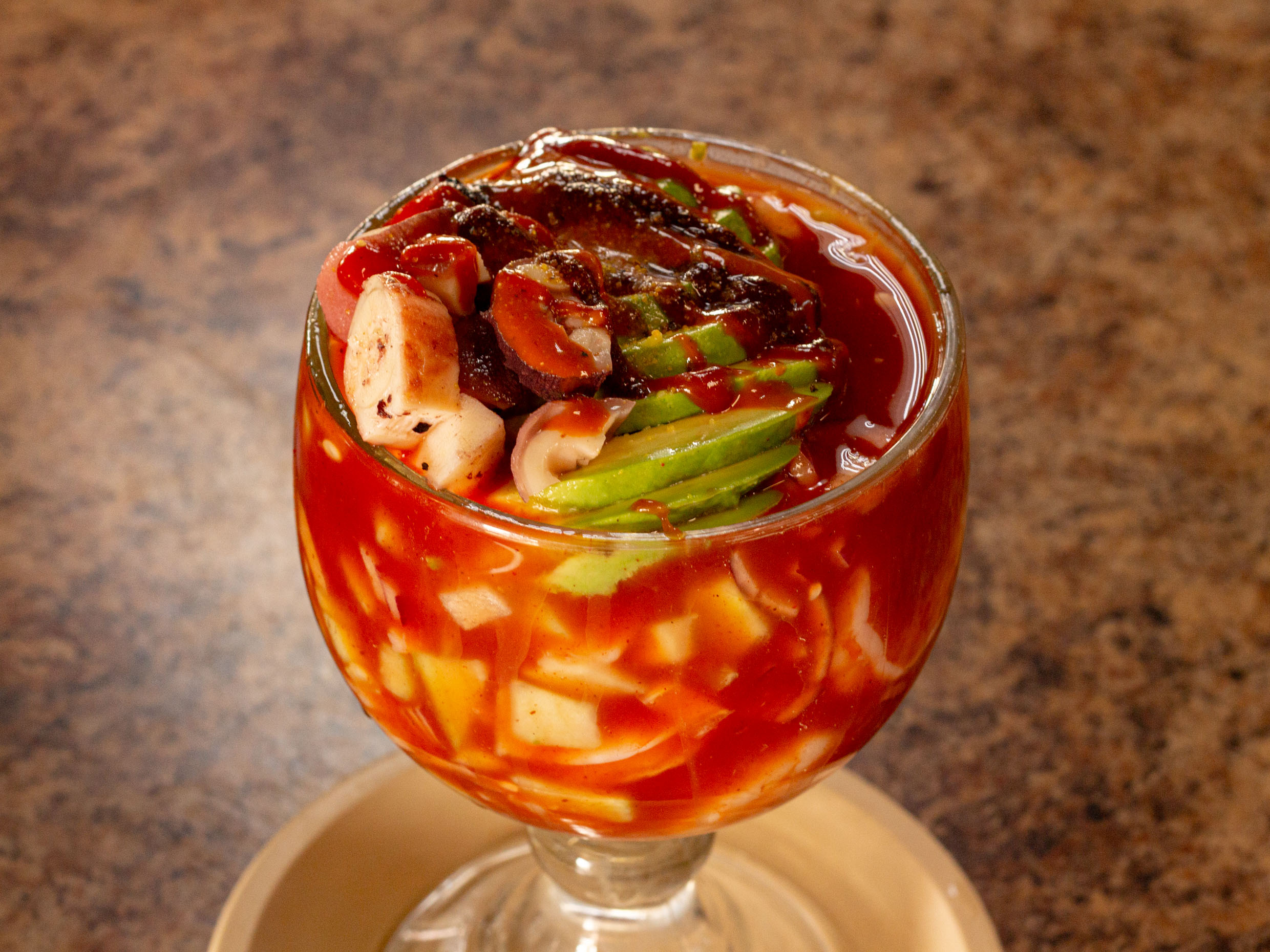 Tostada con ceviche de pescado, camarón cocido, camarón curtido, callo de lobina y calamar.