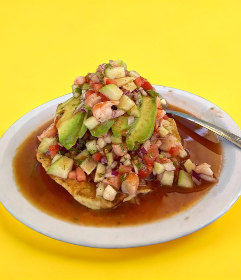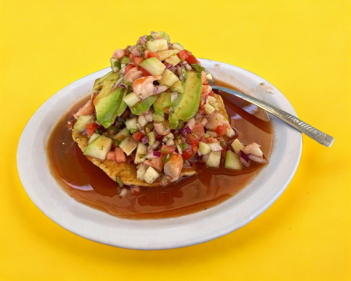 CEVICHE DE CAMARON CON AGUACATE Y SALSAS NEGRAS
