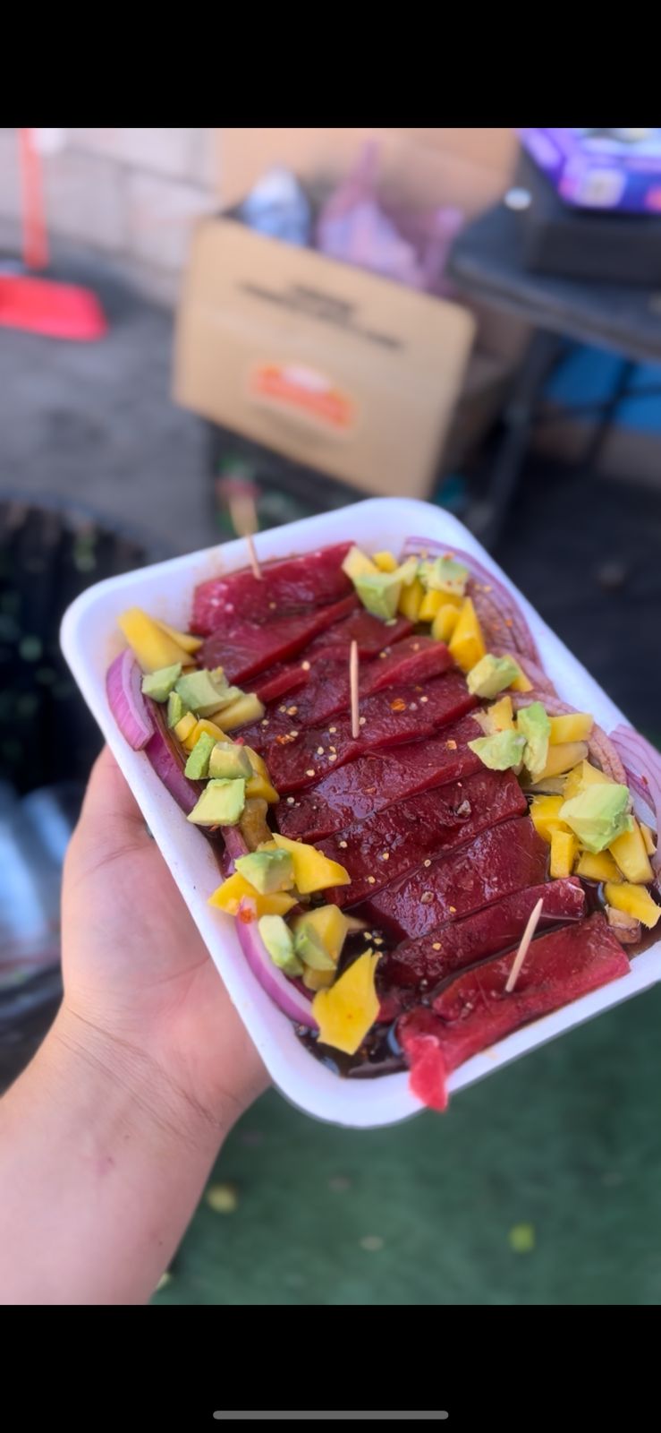 Atún fresco marinado acompañado de mango, cebolla morada y pepino en salsa de la casa.