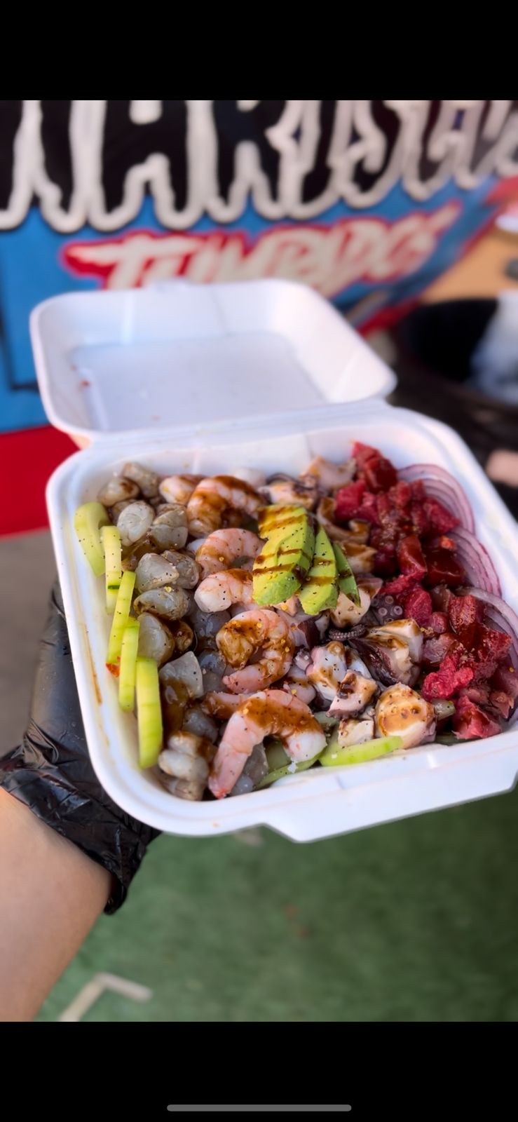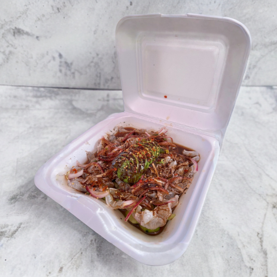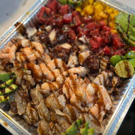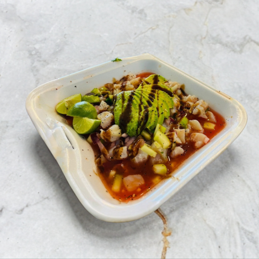 Camarón cocido o curtido, atún, mango, aguacate y pulpo en una mezcla fresca y tropical.