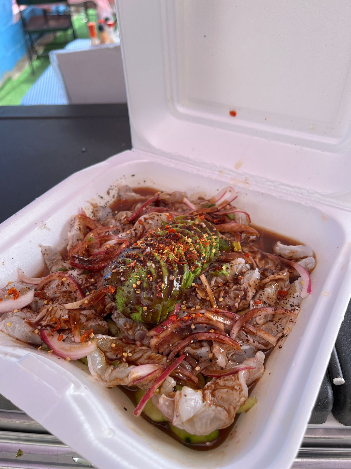 Camarón curtido en limón, bañado en salsa negra especial con cebolla y pepino.