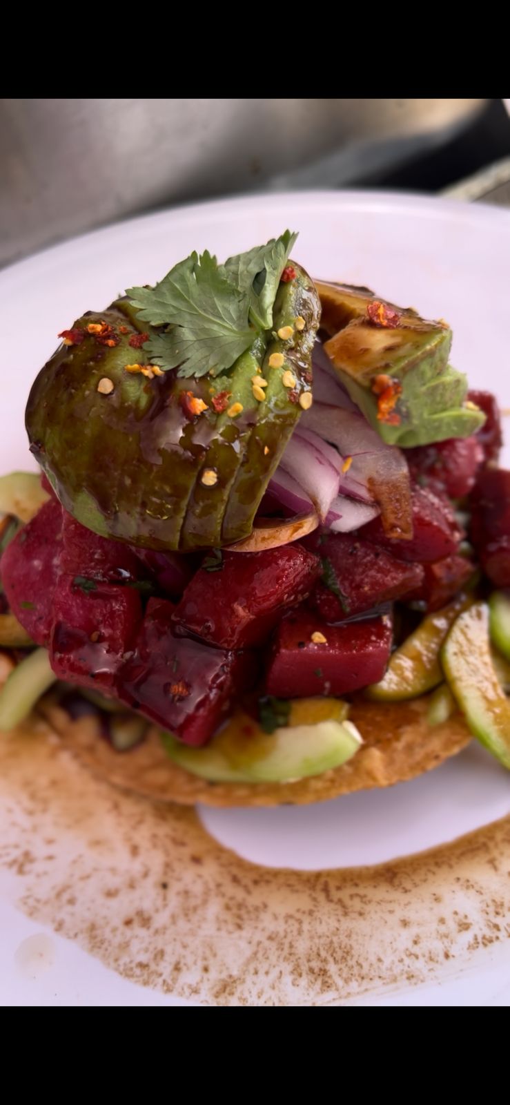 Atún fresco con aguacate, cebolla morada y pepino sobre crujiente tostada.