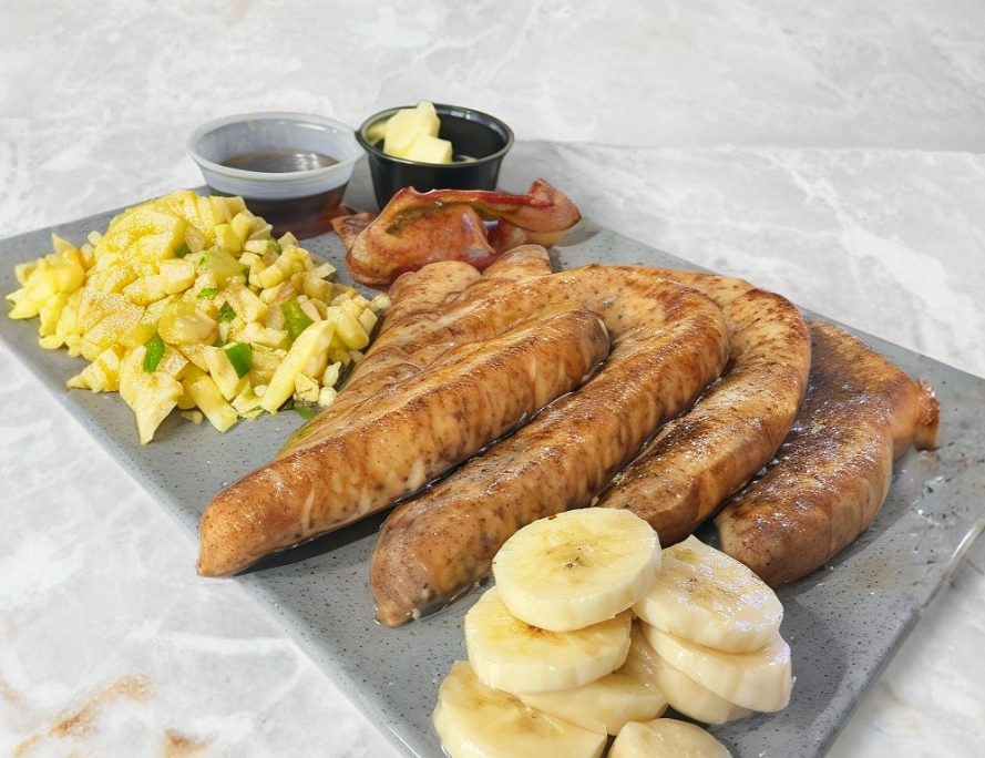 2 Pan Frances, 2 Huevos, 2 Tiras de Tocino, Fruta y Café