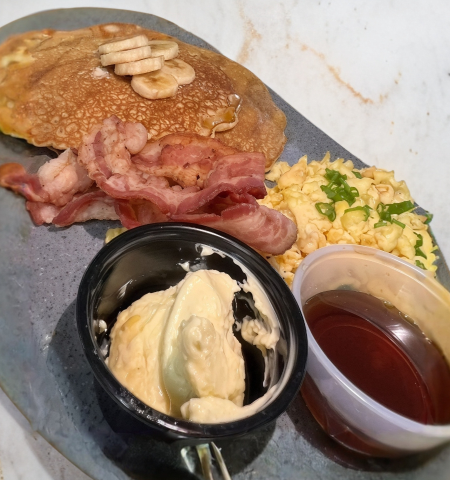 2 Hot Cakes, 2 Huevos, 2 Tiras de Tocino, Platano y Café