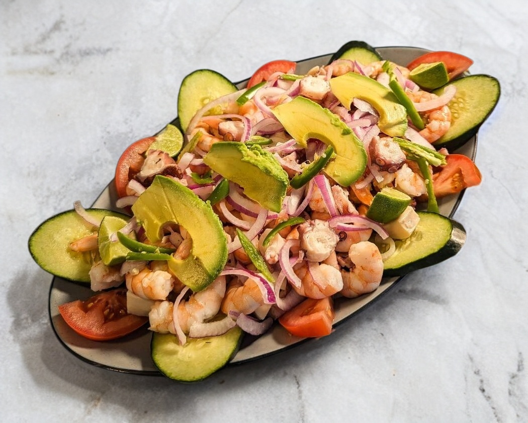 Consta de un platillo camaron y pulpo, sasonado con salsas de la casa