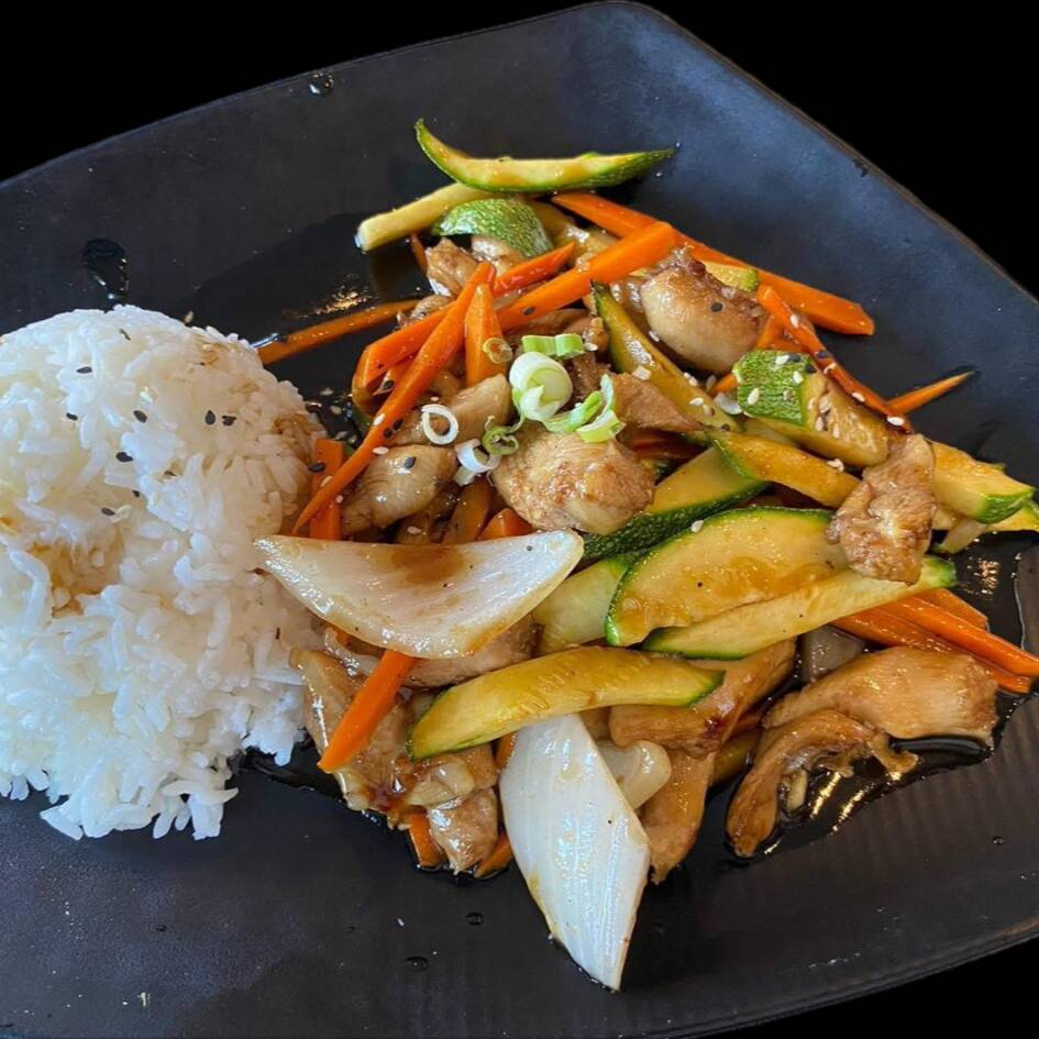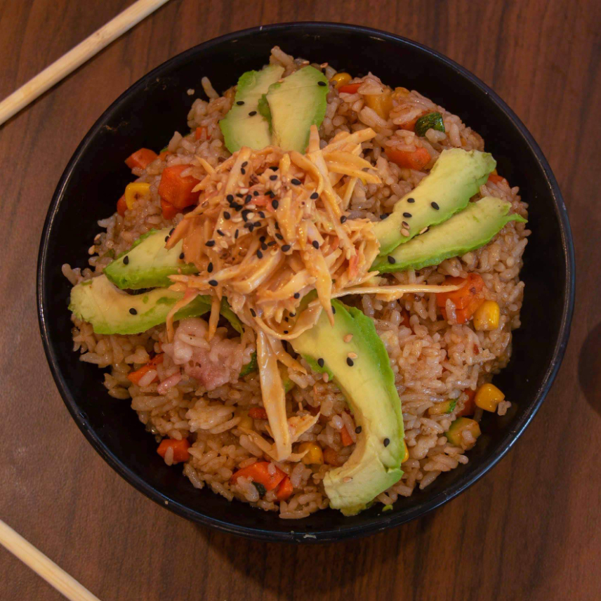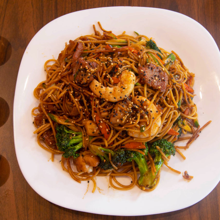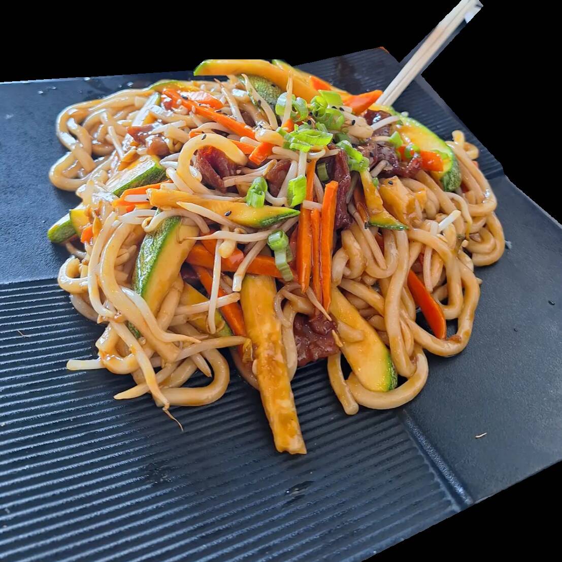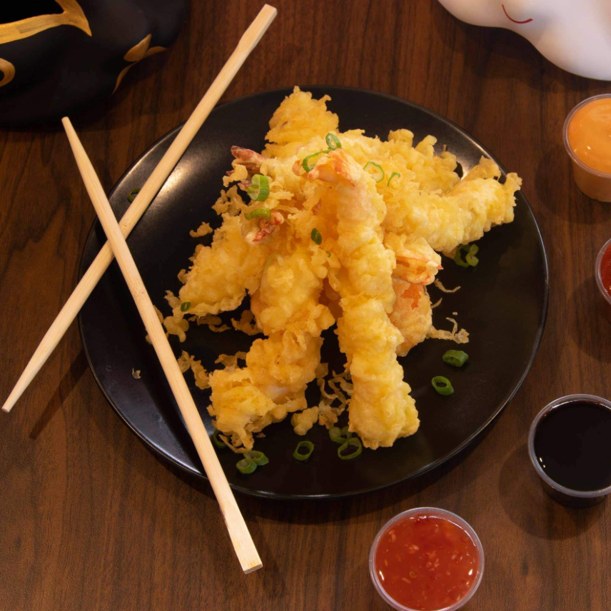 Fideo udon fresco en caldo shoyu. Acompañado de camarones al tempura, alga wakame, hongo shitake, elotitos, medio huevo marinado, cebollitas, chopsuey y aceite preparada