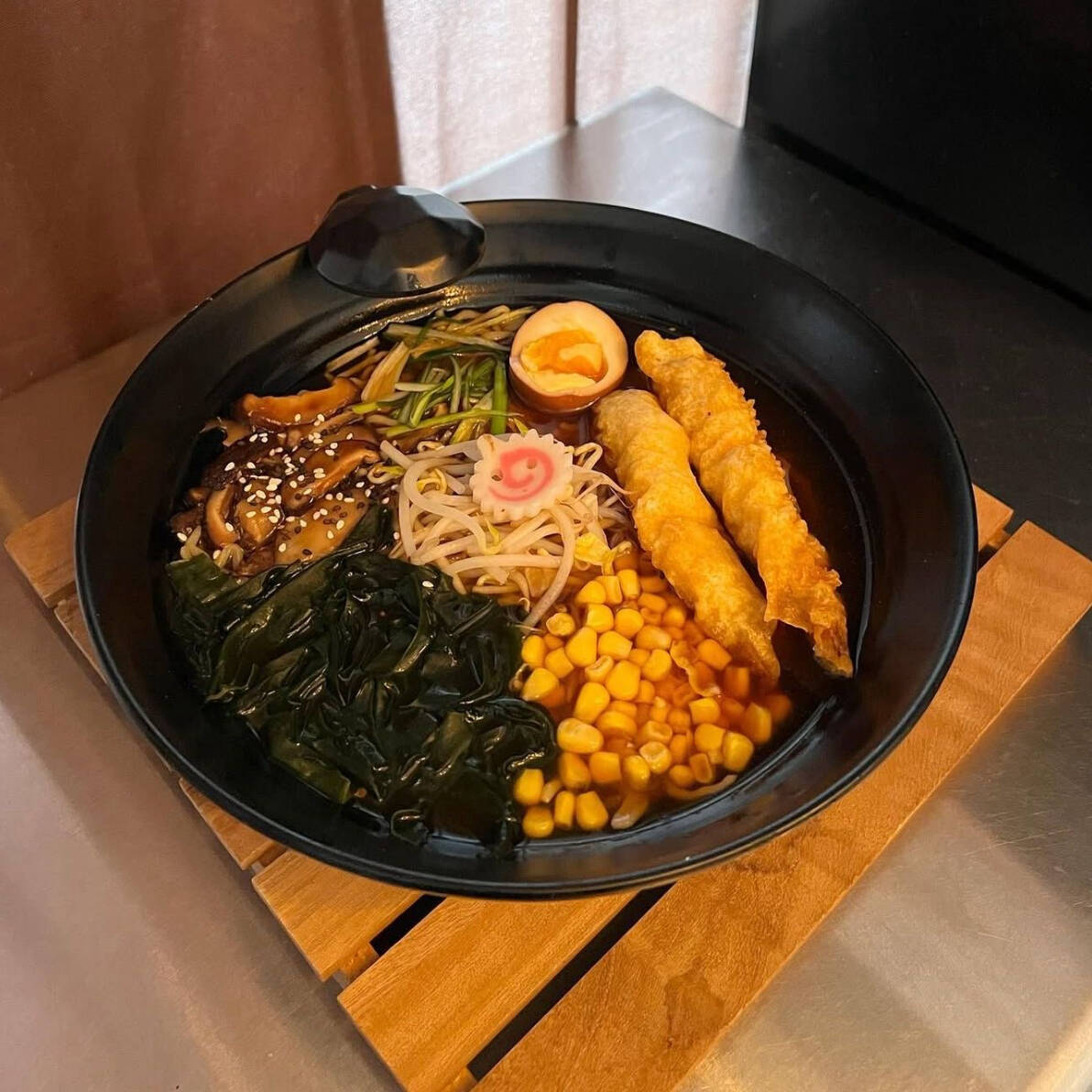 Fideo fresco en caldo Tonkotsu. Acompañado de alga wakame, hongo shitake, elotitos, medio huevo marinado, cebollitas, chopsuey y aceite preparada