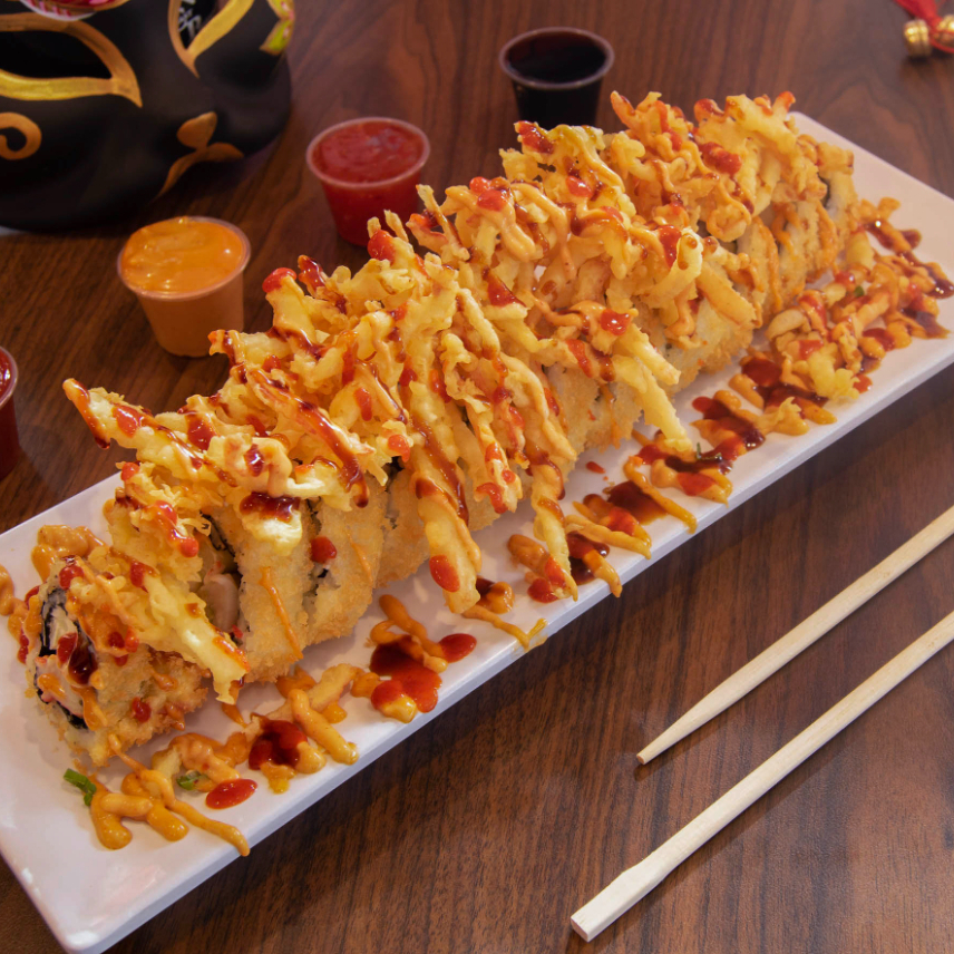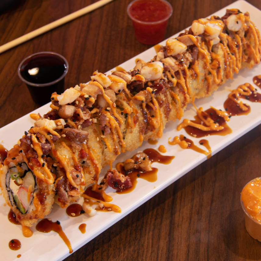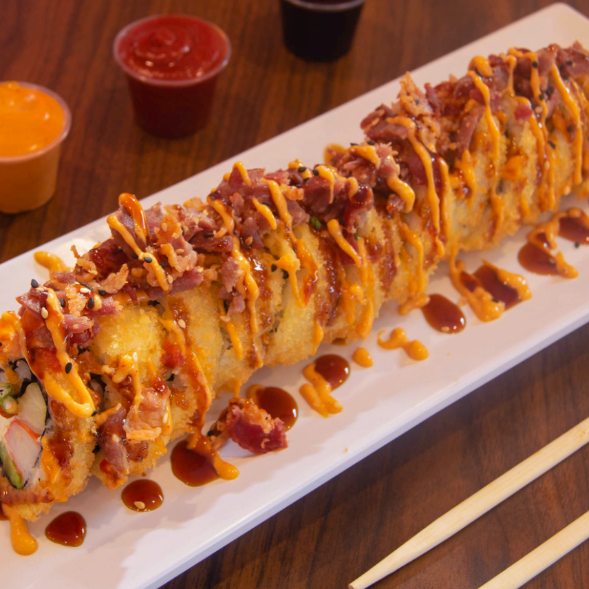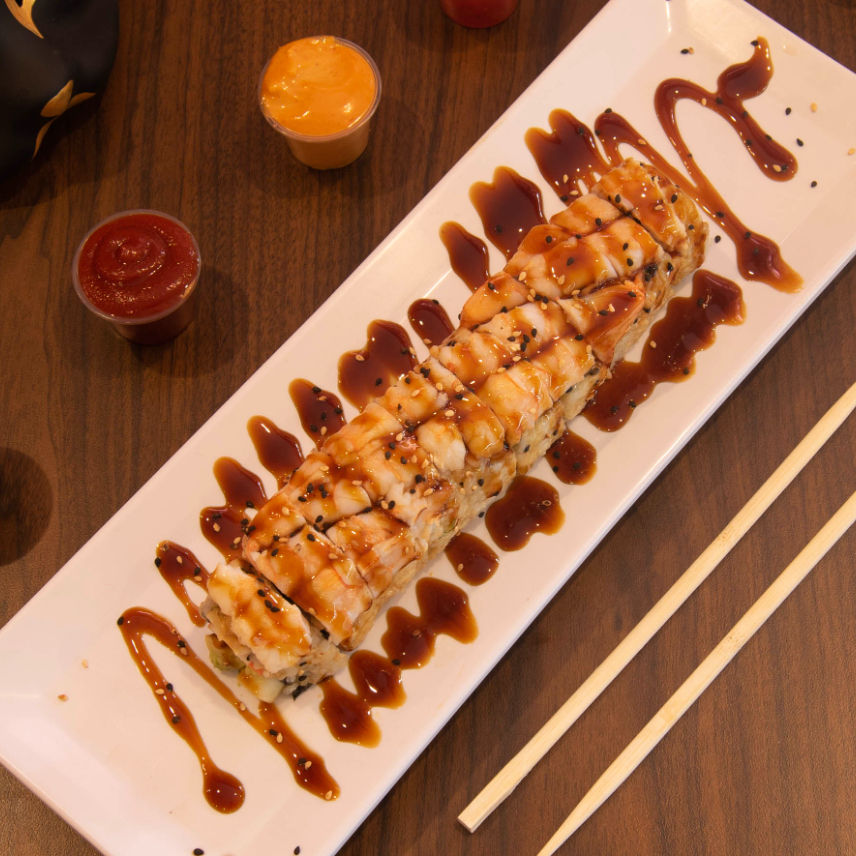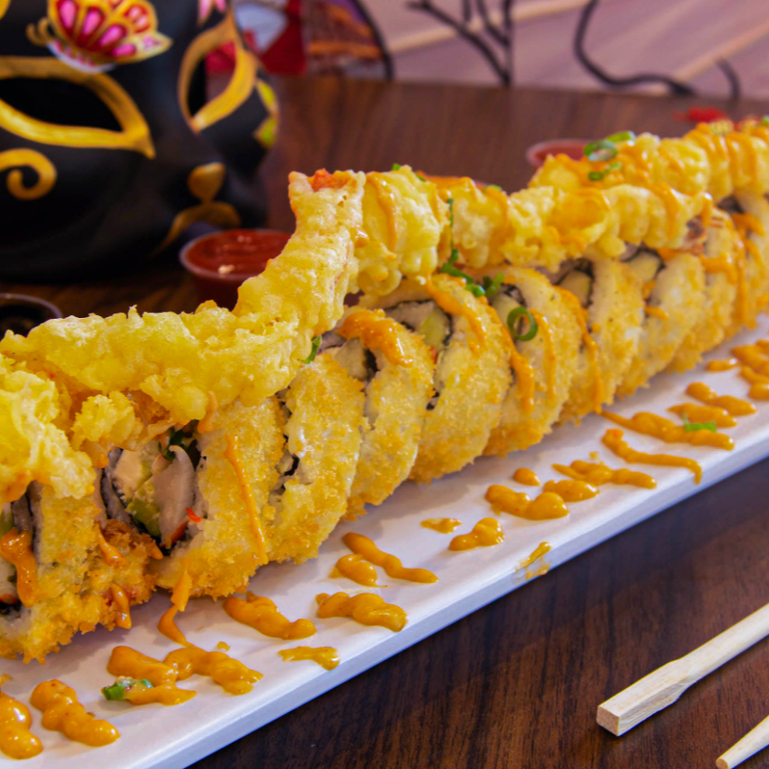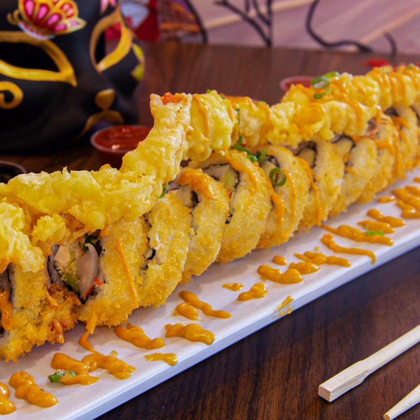 Rollo empanizado por dentro aguacate,philadelphia,pepino y surimi con topping de camarones capeado