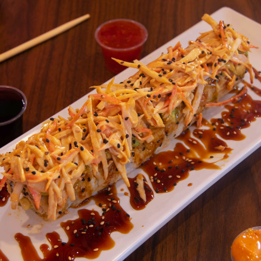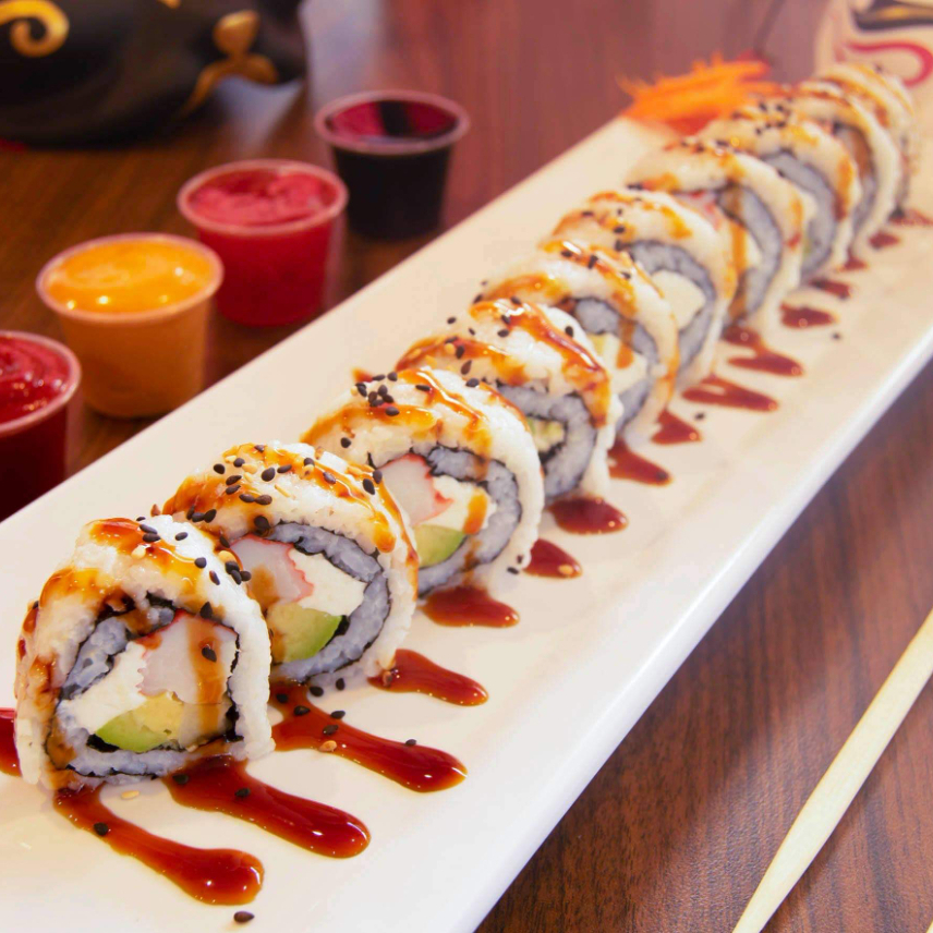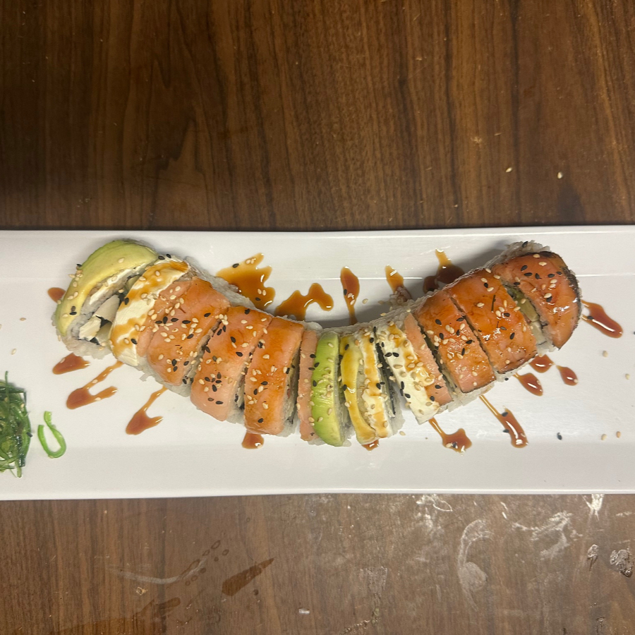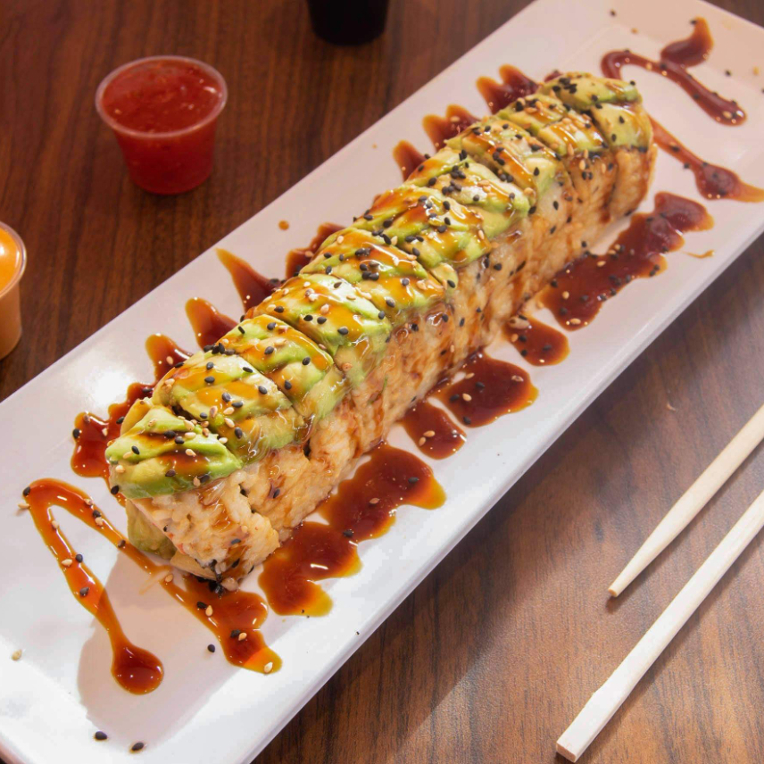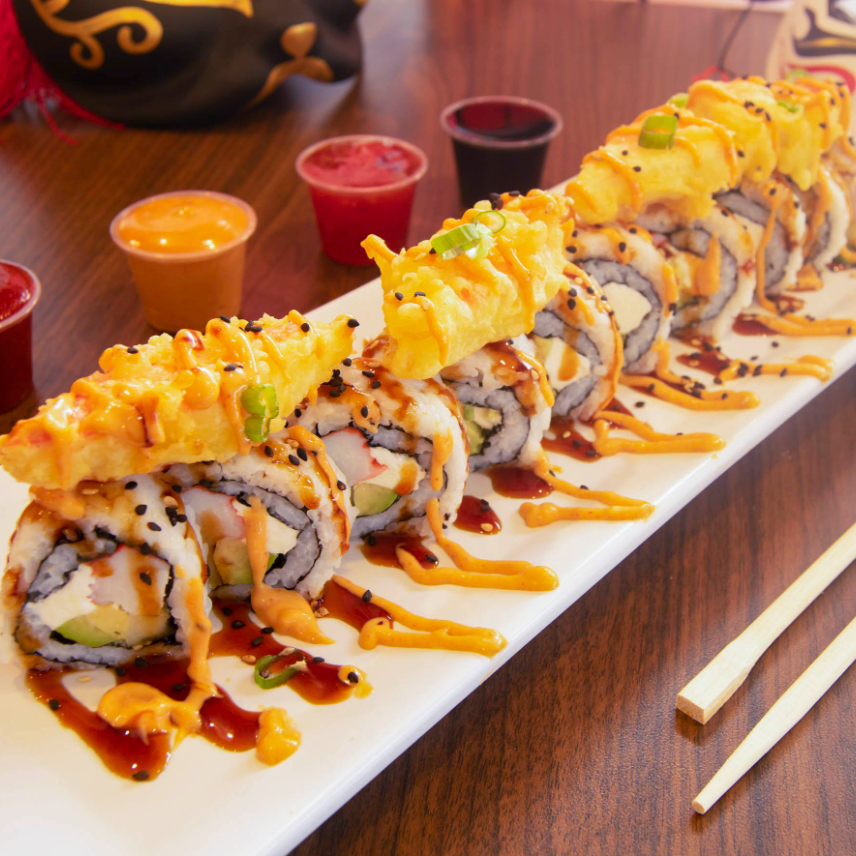 Rollo empanizado por dentro aguacate,philadelphia,pepino y surimi con topping de camarones capeado