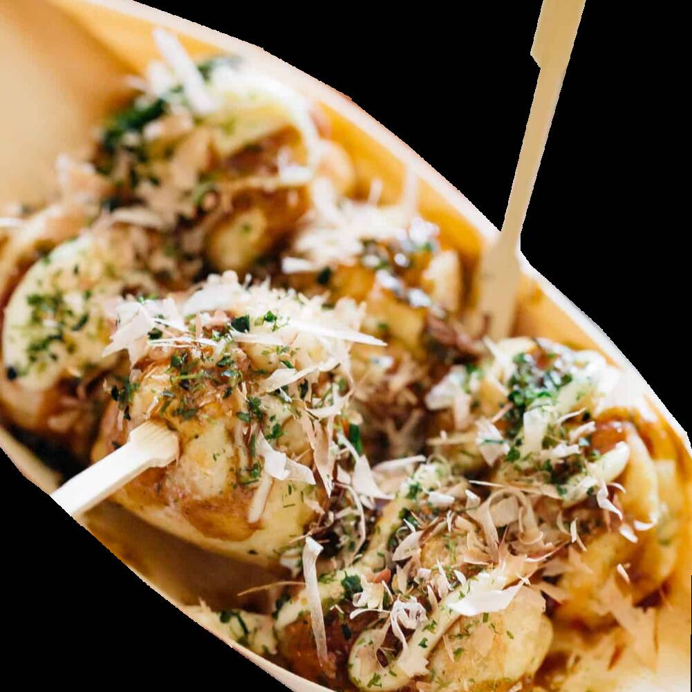 Bolitas de masa preparada con pulpo,coronado de bonito flakes , cebollin, mayonesa preparado y ajonjoli