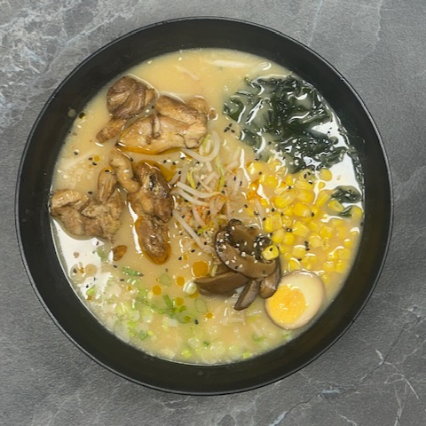 Fideo fresco en caldo Tonkotsu. Acompañado de pollo en salsa de la casa, alga wakame, hongo shitake, elotitos, medio huevo marinado, cebollitas, chopsuey y aceite preparada