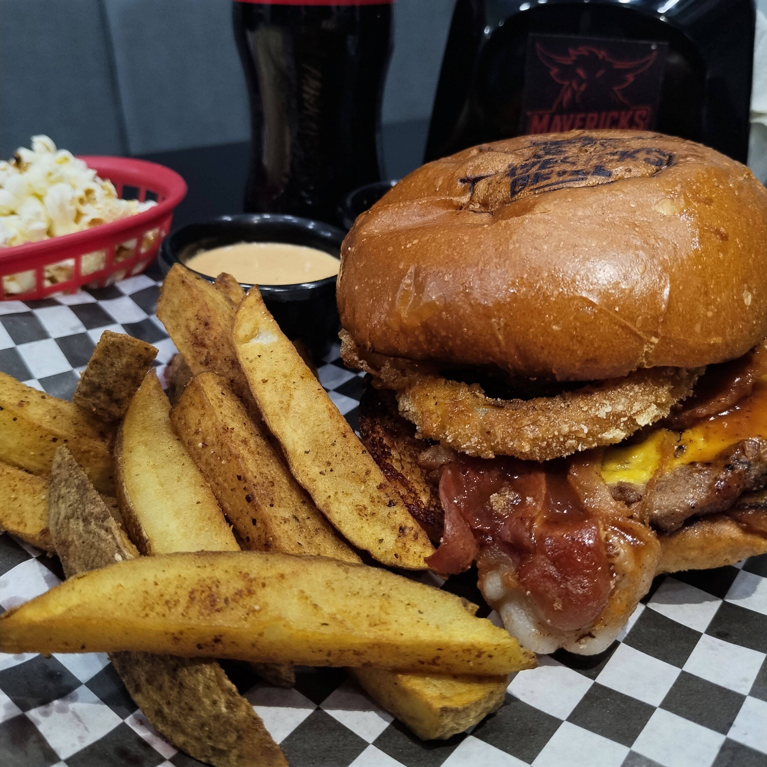 Delicioso pan Brioche con, carne,queso, aros de cebolla empanizado y bbq