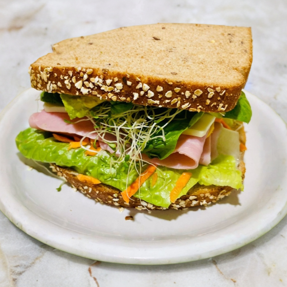 🥪 No es cualquier sándwich, es una obra maestra entre panes. Pan de 12 granos, mayonesa, lechuga crujiente, jamón en dos tiempos (sí, doble), queso amarillo y blanco, zanahoria rallada, pepino fresco, espinaca, alfalfa y aguacate. Literal: el combo saludable que también consiente. Pura frescura en cada mordida.